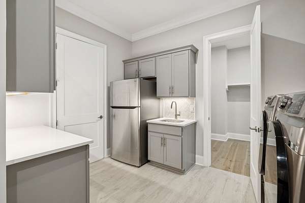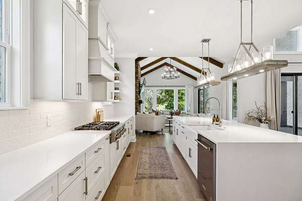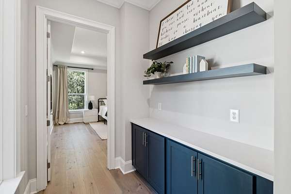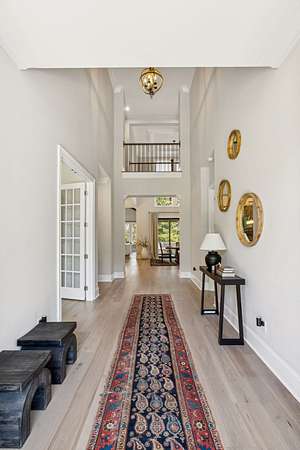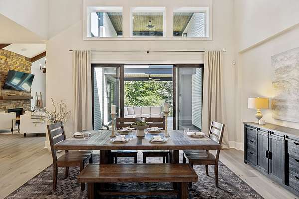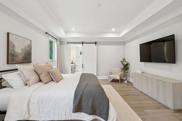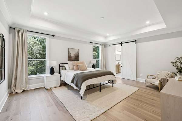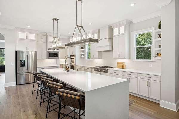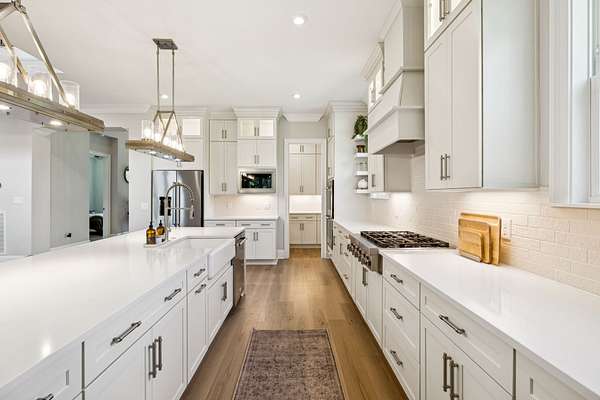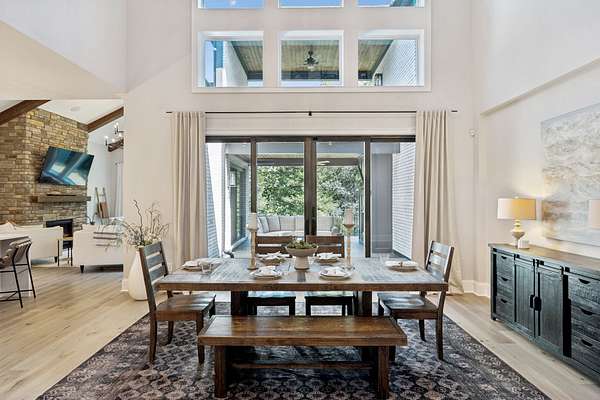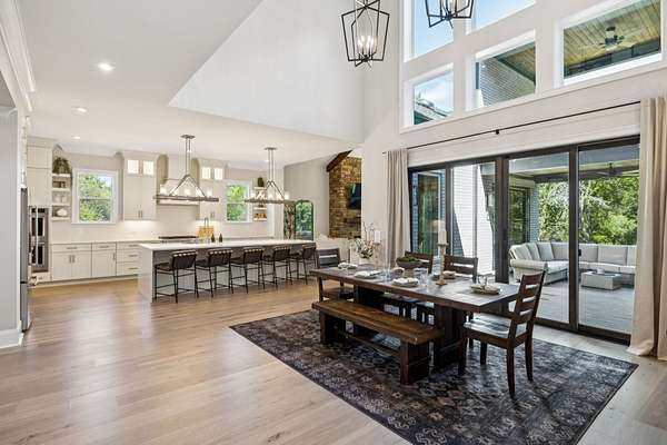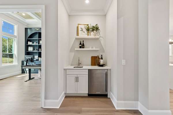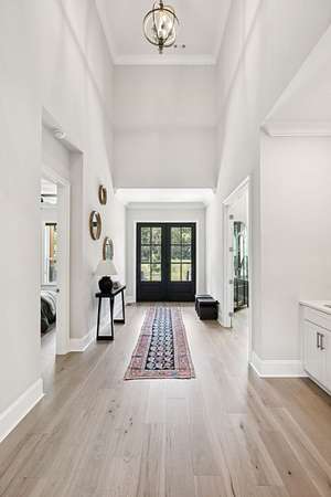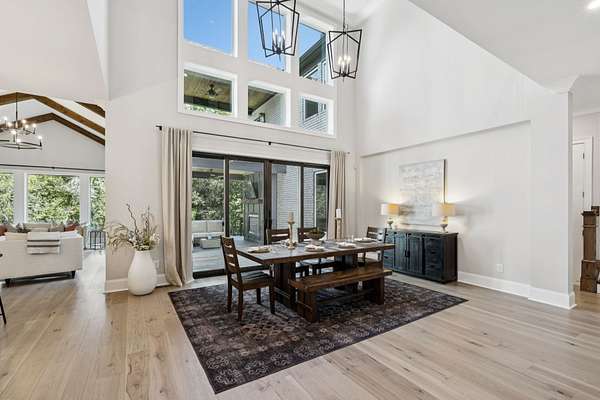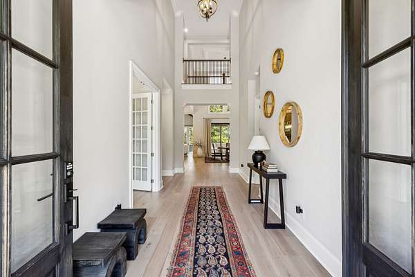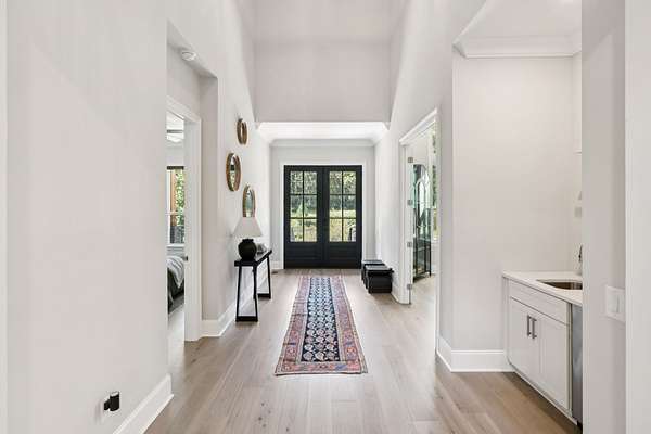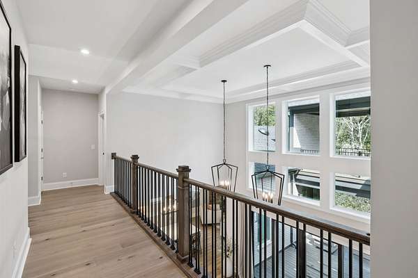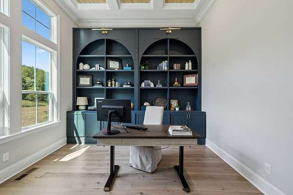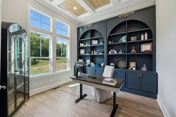 The main level offers a grand two-story foyer and dining room, an inviting office with glass French doors, and a seamless flow between the living room and chef's kitchen. Custom cabinetry, coffered wood-detailed ceilings, and wide-plank hardwood floors highlight the attention to detail. The spacious walk-in pantry, mudroom, and oversized laundry are designed with everyday convenience in mind.