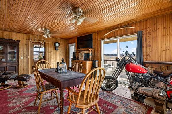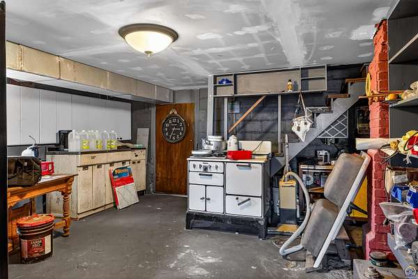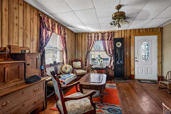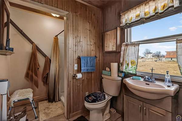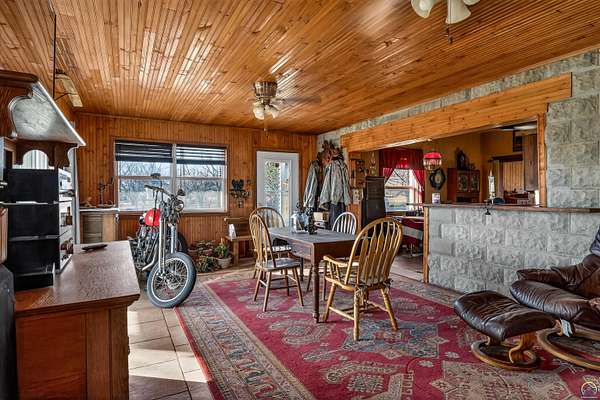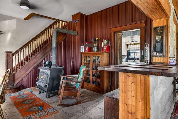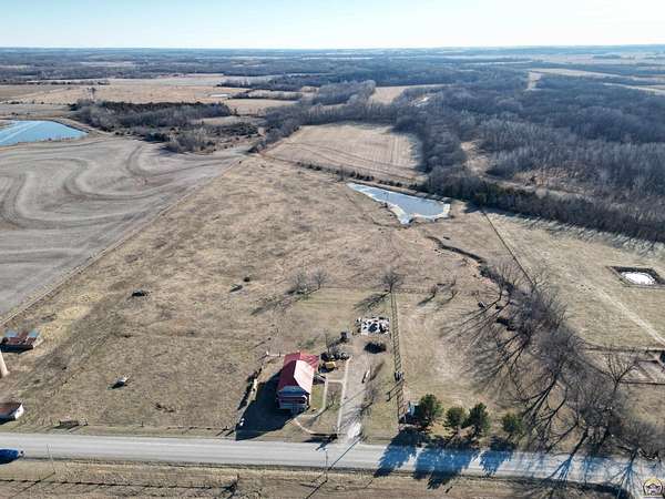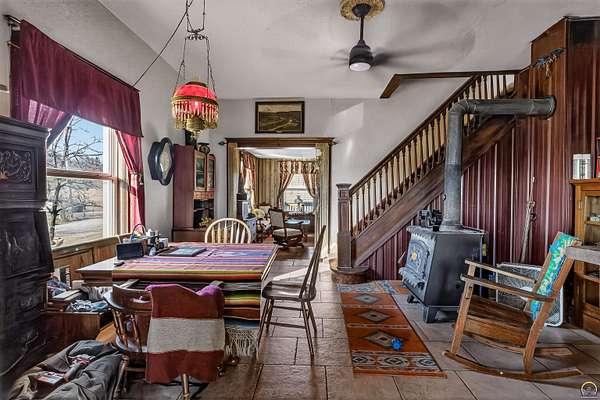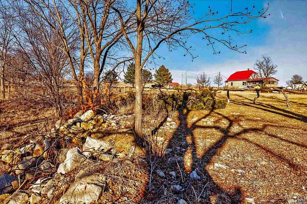 This historic homestead constructed in 1905, is a homesteaders, hunter/wildlife lovers, Air B&B potential for nearby Lake Perry or a horse-lover's dream. Architecturally classic stone home has not only withheld through time, but has had a beautiful continuance of improvements and updates on site bringing into modern times. Entering in the historic wood floors and original wood accents, doors, stairwell, flooring is evident throughout. Grand spaces, with the original parlor turned into the Primary bedroom on main floor. Two refurbished full bathrooms exist on the main floor level, with a full laundry center. Gather a book and coffee on a cold night and sit by the wood burning stove. Towards the back, elements like original doors have been used for countertop, natural beadboard accents like a log cabin on the south family room overlooking the Kansas countryside. The upstairs offers two large bedrooms. The walkout Basement has been refurbished and added onto over the years, with current owner in process of providing a kitchenette and bathroom. The exterior offers plenty of grassland on your 2 acres, with a wooded area to the west with nature walk and bridge over the waterway. A rustic fenced in pasture offers a great location for your horse care, or other farm life experiences. Utilities are reasonable with the thick stone walls and additional insulation added, plus the added wood stove on cold nights.