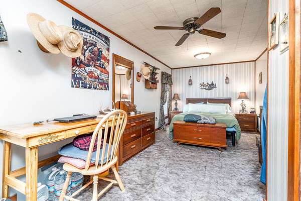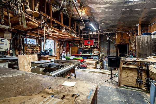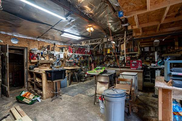 For hobbyists, the impressive 20x40 block shop (formerly a gas station) is ideal as a wood shop and includes a working wood stove for heat and a workbench that will remain. A 40-ft shipping container sits next to the shop for additional storage. Multiple outbuildings have power, and one shed also houses pond aeration controls.
