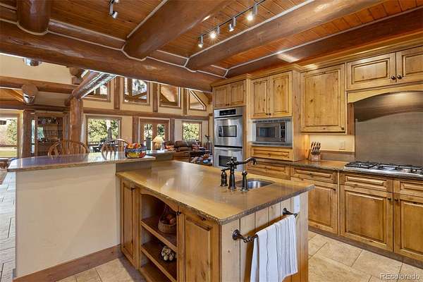 Privately positioned on 2.5 forested acres in Larkspur, within the gated Bear Dance community, this custom mountain lodge residence overlooks the 8th green while remaining thoughtfully set back for privacy. Handcrafted Canadian logs, soaring tongue-and-groove ceilings, and rich stonework define interiors that feel both grand and grounded. Expansive windows and multiple walkouts connect the home to shaded decks, covered patios, and tranquil outdoor living spaces designed to enjoy the surrounding pines, water feature, and peaceful golf course views.