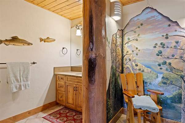 Outside, the home presents the look of an iconic Colorado lodge, with outdoor living spaces designed for year-round use. The covered timber deck features copper-accented details, and the lower covered patio offers shaded seating and a hot tub. A flagstone walkway leads to an additional flagstone patio with a sculptural water feature. Located within the upscale, gated Bear Dance community—known for its top-ranked championship golf course—this property offers privacy, craftsmanship, and the Colorado lifestyle that makes Larkspur one of the most sought-after settings.