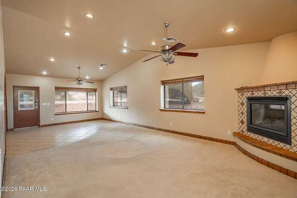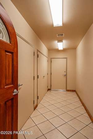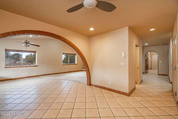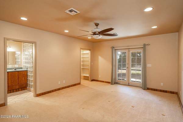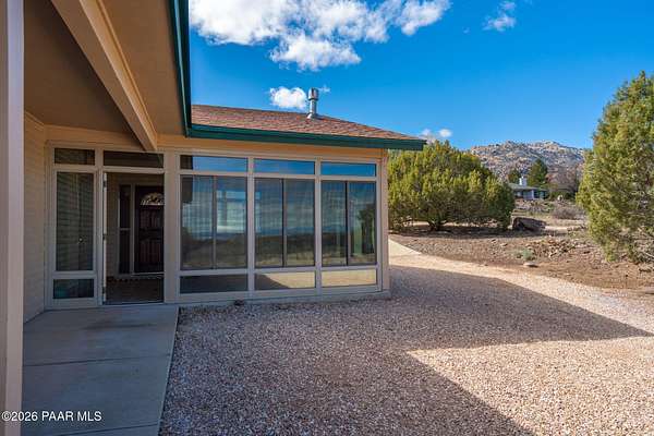 RARE OPPORTUNITY with 100 MILE VIEWS of SAN FRANCISCO PEAKS. 1-Story Brick Construction on 2.2 acres at the base of Granite Mountain completely rebuilt and updated in 2007. Saltillo tile base boards and Santa Fe Style accents. Arched solid core interior and exterior with steel casings, oversized tile flooring, custom kitchen cabinets and stainless-steel appliances. New kitchen sink and Faucet. Separate workshop/studio/car barn with storage shelves, added electrical outlets and Swamp Cooler. Extra storage closets in primary residence. New $18,000 HVAC system. Hot Tub on covered back patio. French Door access to back patio from Primary Suite and Bedroom 2. Covered side patio of Formal Dining Area. Informal / Bistro Dining area inside the oversized kitchen.