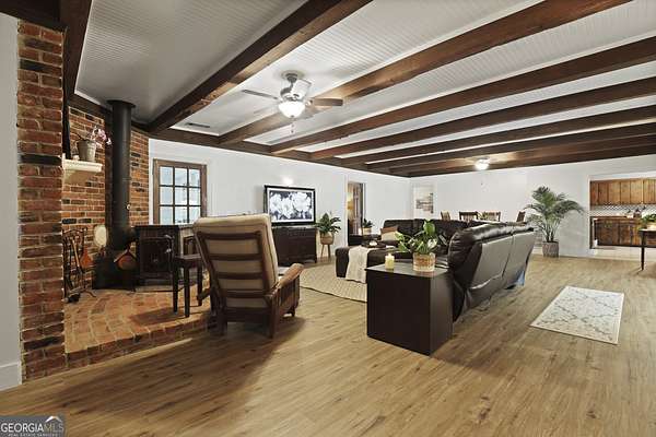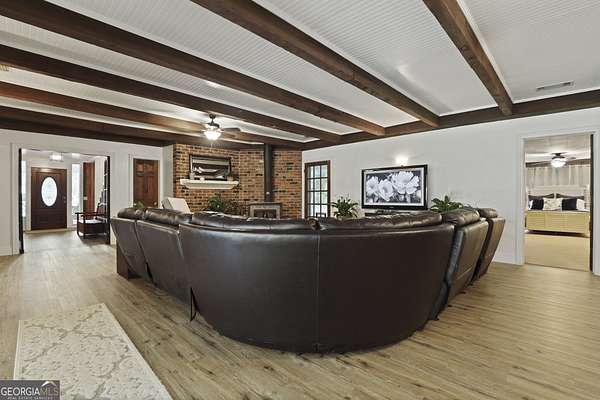 LOCATION AND SPACE! Unique opportunity-ideal for two-family living, multigenerational use, or an income-producing vacation rental! This spacious country home sits on 4.9 private acres just 10 minutes from Georgia Southern University and I-16, with easy access to Savannah, shopping, restaurants, hospitals, and the airport. Home features 7 bedrooms, each with its own private bath, including an oversized master suite with walk-in closet, separate tub & shower, and space for a sitting area. The semi-wraparound front porch welcomes you into a wide foyer, flanked by two bedrooms (or office/library space) and an upstairs loft. The large family/dining room combo includes a focal point of antique brick wall, Soapstone wood burning stove and wood floors and beautiful real wood beams in ceiling. The open kitchen offers an abundance of cabinets and counter space with a wall of windows overlooking a grape arbor. From the Laundry Room access the second living area for an in-law or guest suite which includes its own den, kitchen, 3 bedrooms with en-suite baths, and private entrance from a large concrete patio-ideal for rental income or extended family. From the front porch swing, you can enjoy morning coffee, overlook the firepit and beautiful countryside and hardwood trees. This is for the buyer who appreciates character and space.