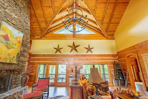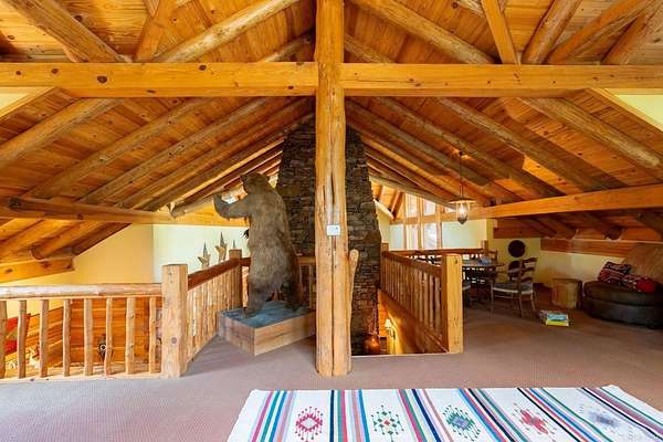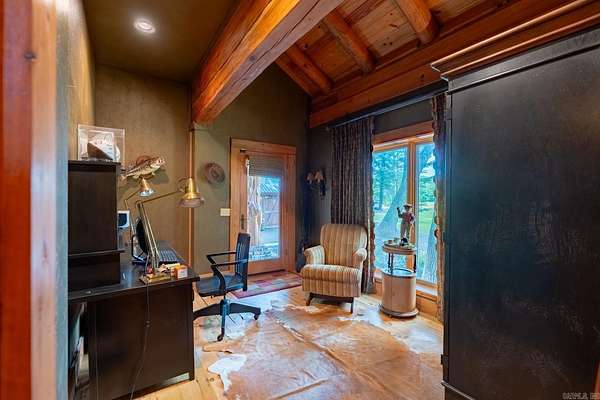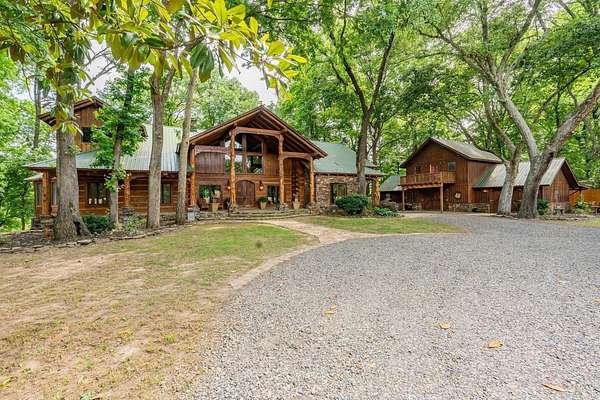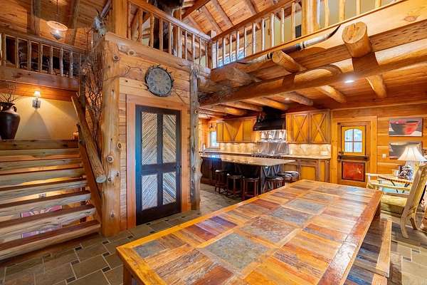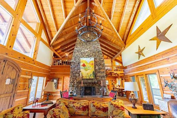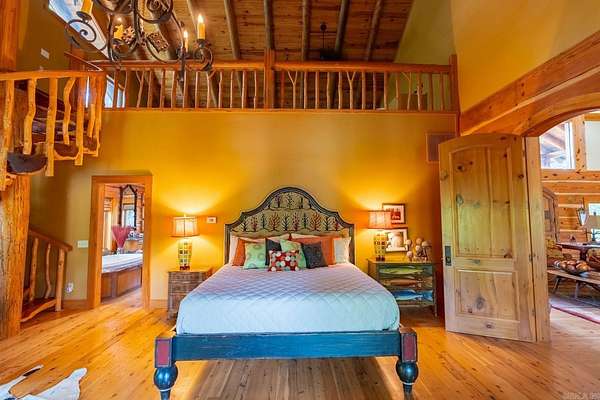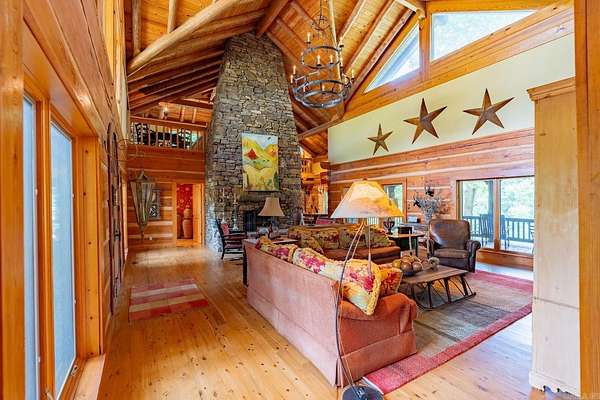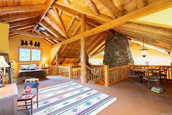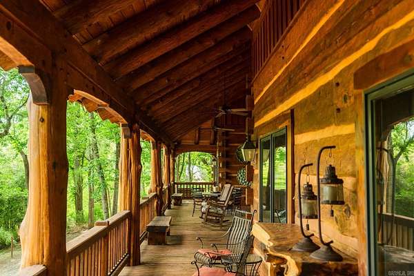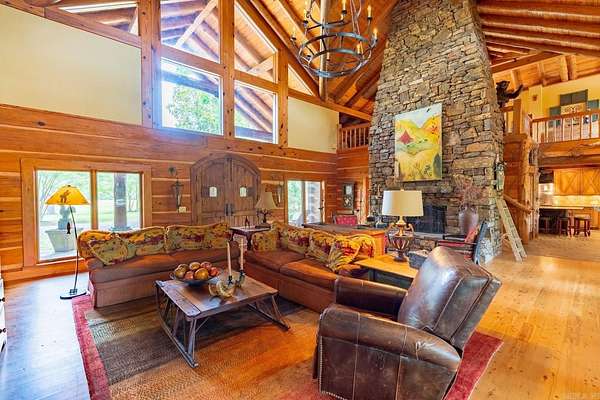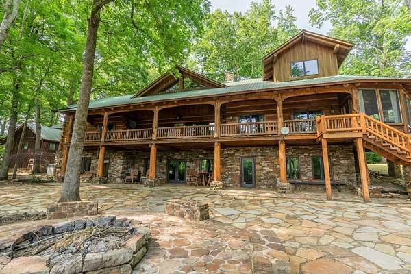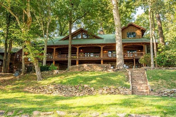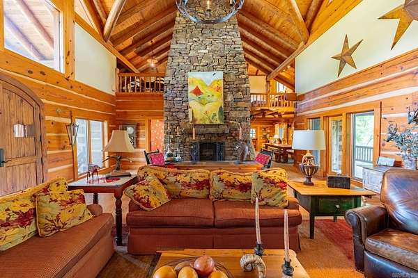 Spectacular Little Red River home on 2 river lots! This 5-bedroom 3.5 bath home has options for more bedrooms if needed! Made from very high-end log construction, this home includes a massive main living area with 2-story ceilings, a large dry-stack stone fireplace, exposed logs and beams, wood floors, multiple balcony and living areas, luxurious kitchen with granite tops, tile floors, 8-burner Viking cook-top, spacious breakfast bar, cozy office, incredible master suite with private loft, large boat dock with huge fishing platform, firepit, basement-area kitchenette, downstairs fireplace, wine room, garage storage, covered parking with apartment above, massive covered deck overlooking the river, easy walk to the dock, metal roof, stone patios and much, much more! A lovely, well-cared-for home!