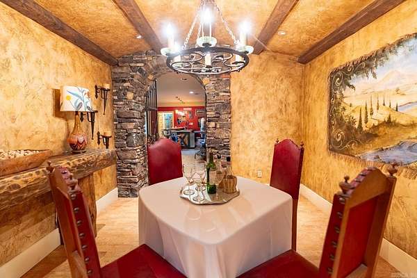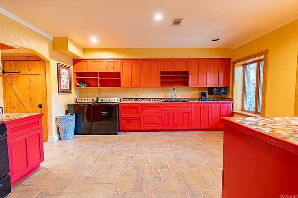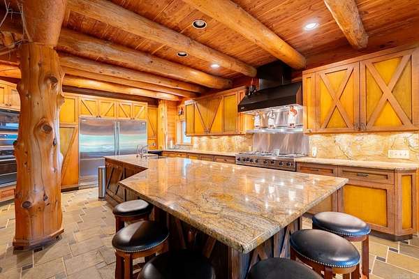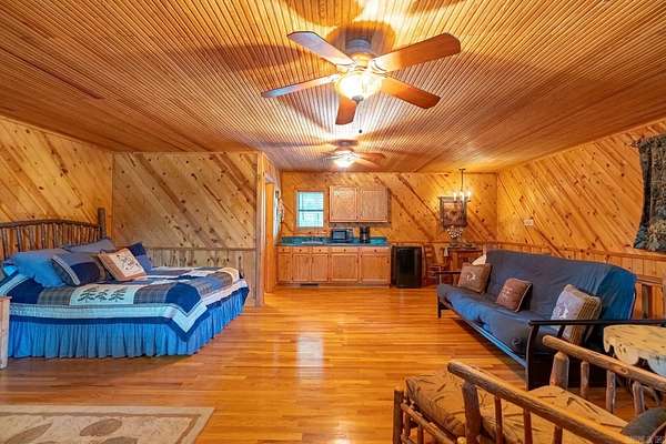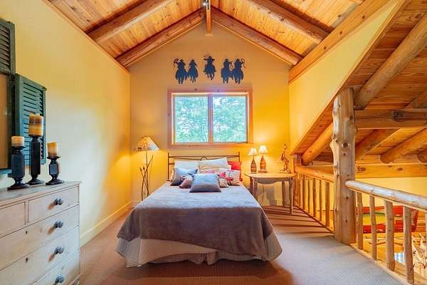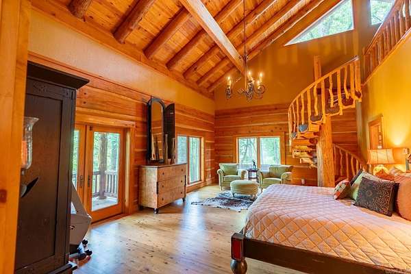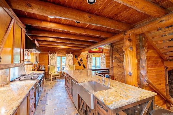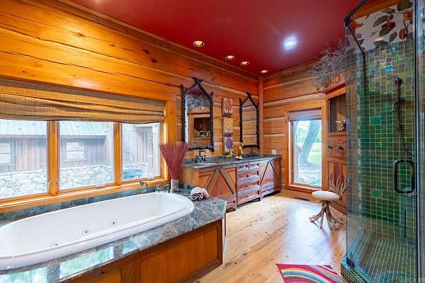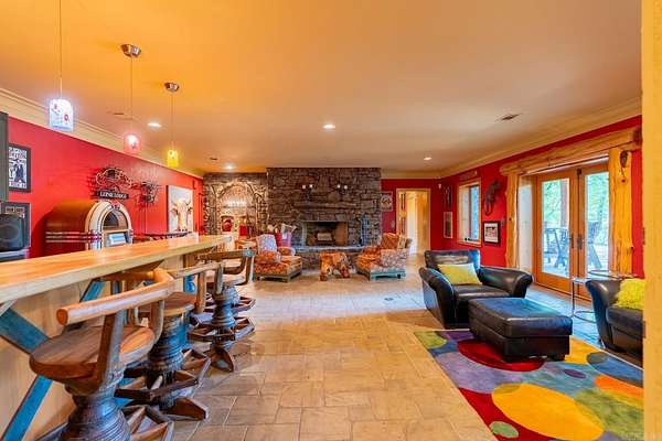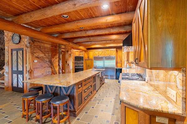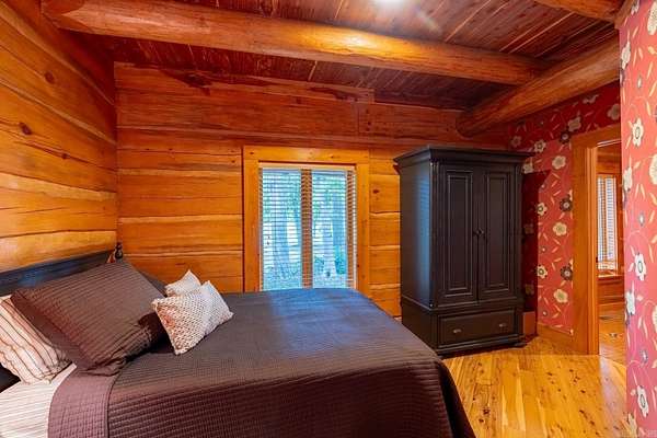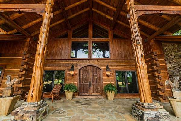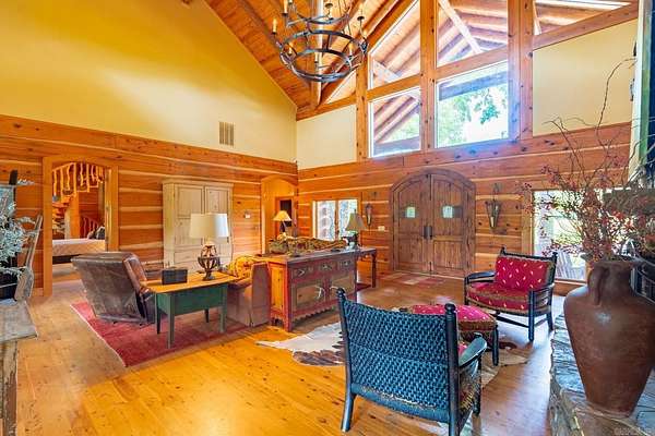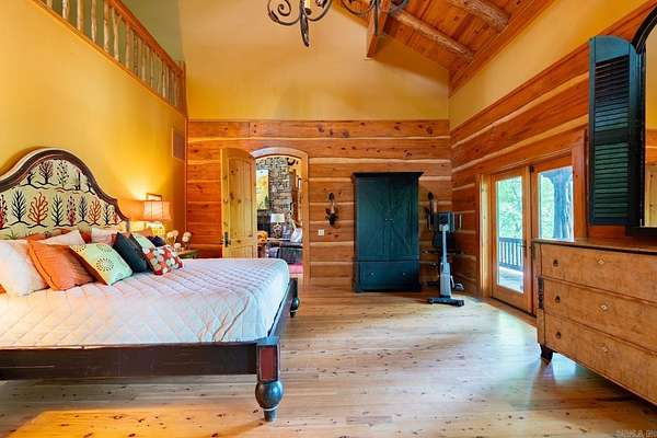 Spectacular Little Red River home on 2 river lots! This 5-bedroom 3.5 bath home has options for more bedrooms if needed! Made from very high-end log construction, this home includes a massive main living area with 2-story ceilings, a large dry-stack stone fireplace, exposed logs and beams, wood floors, multiple balcony and living areas, luxurious kitchen with granite tops, tile floors, 8-burner Viking cook-top, spacious breakfast bar, cozy office, incredible master suite with private loft, large boat dock with huge fishing platform, firepit, basement-area kitchenette, downstairs fireplace, wine room, garage storage, covered parking with apartment above, massive covered deck overlooking the river, easy walk to the dock, metal roof, stone patios and much, much more! A lovely, well-cared-for home!