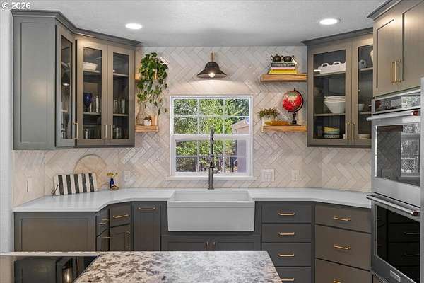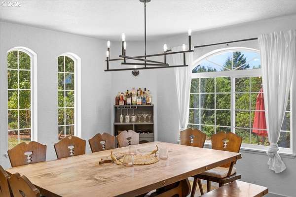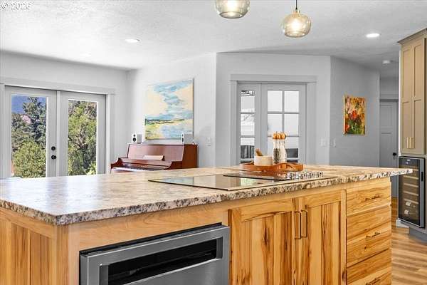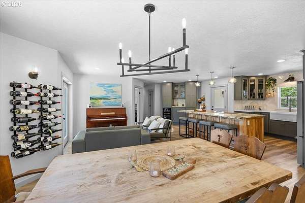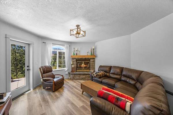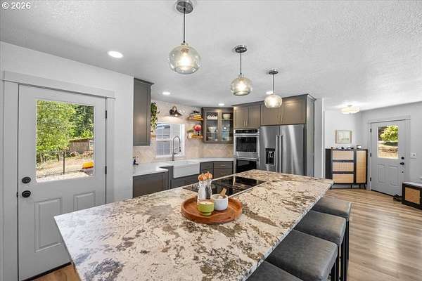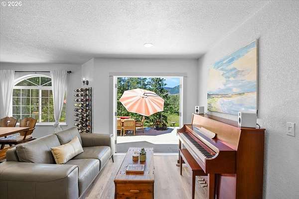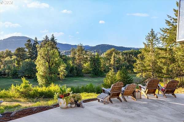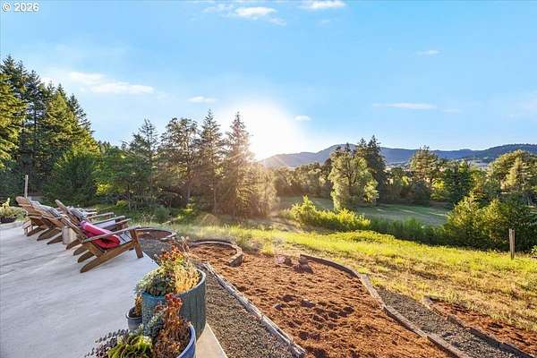 Rare opportunity to own a private 10-acre creekfront estate in one of the Umpqua Valley's most scenic settings. Overlooking rolling farmland, vineyards, salmon bearing Calapooia Creek, and the Tyee Mountains, this property delivers exceptional privacy, open views, and true country living. The single-level home features unique architectural design and has been completely renovated from top to bottom. Built in 1997, the home offers 3 bedrooms, 2 bathrooms, and approximately 1,560 square feet of thoughtfully updated living space. Recent upgrades include a brand-new roof (June 2025), exterior paint (July 2025), new interior and exterior doors, new flooring, and updated millwork throughout. The new gourmet kitchen was designed to impress, featuring custom cabinetry, a cook island with eat bar, granite and quartz countertops, apron sink, double ovens, stainless steel KitchenAid appliances, herringbone subway tile backsplash, soft-close drawers, designer lighting, and a built-in pantry with coffee bar and wine cooler. The kitchen opens to a dining and living room combo, with a separate family room offering a cozy wood-burning fireplace. The primary suite is spacious and private, complete with a brand-new bathroom featuring a custom tile shower, quartz counters, and custom vanity. Luxury vinyl plank flooring flows throughout the home, including the guest bedroom and bathroom located opposite the primary suite.Both the living and family rooms open to a newly poured concrete patio, creating the perfect space to take in the sweeping valley and mountain views. The land offers approximately 5 acres of flat, fertile bottom ground bordered by the Calapooia Creek ideal for crops, livestock, or hobby farming. The remaining acreage consists of native timberland with mature Black Oak and Douglas Fir, providing privacy and abundant wildlife. Located on a low-traffic road just 10 minutes from town, this property offers a rare combination of usable land, scenery, and convenience.