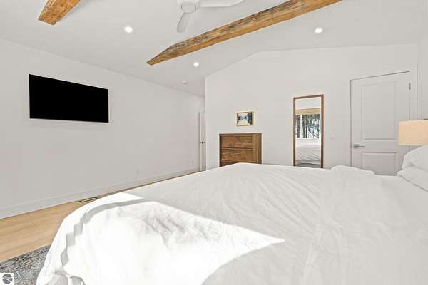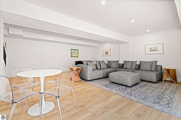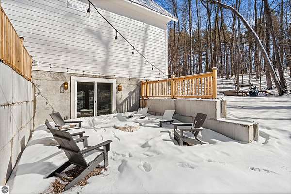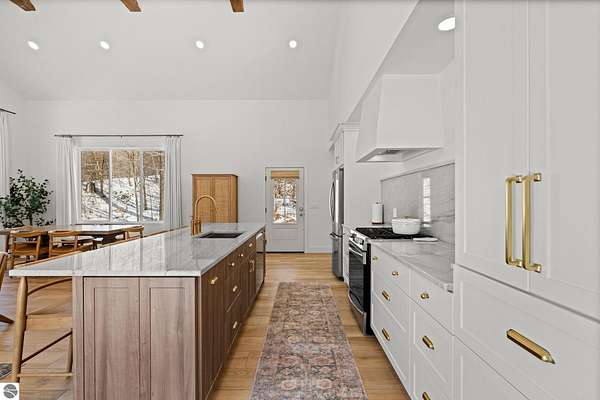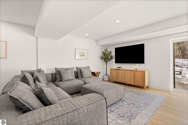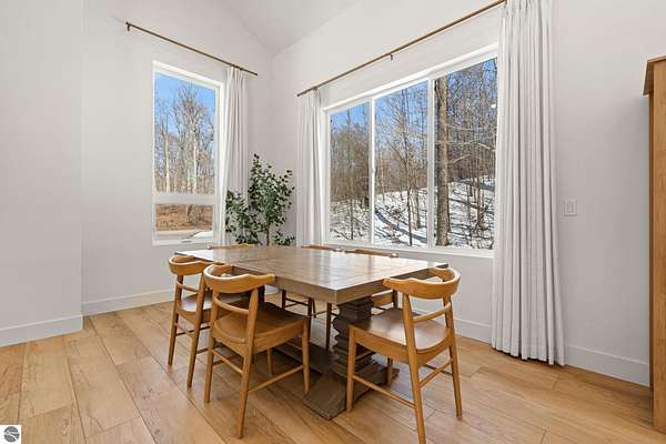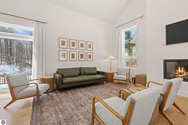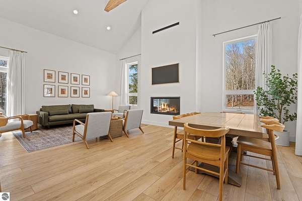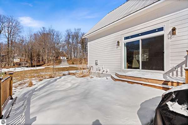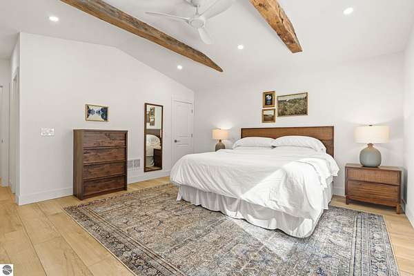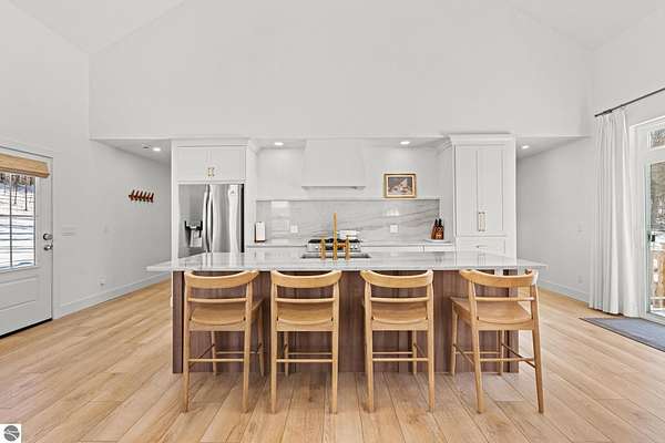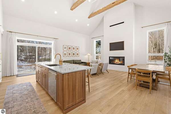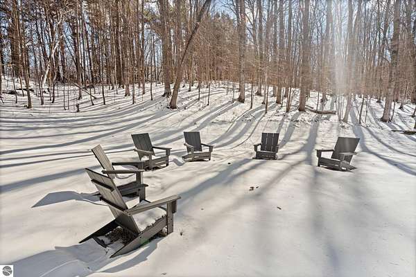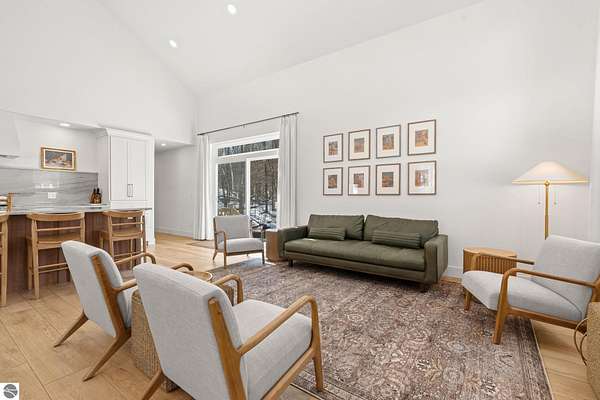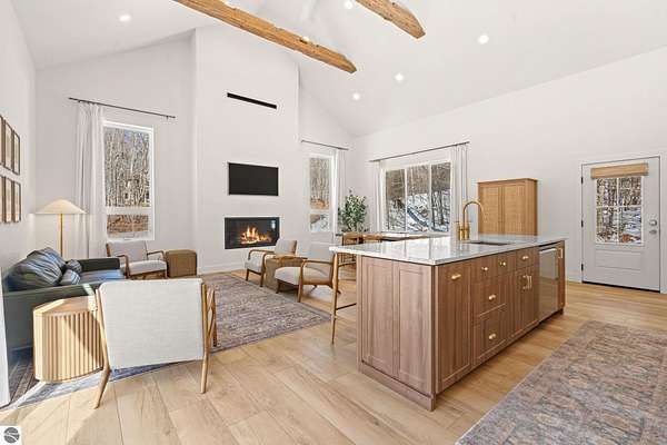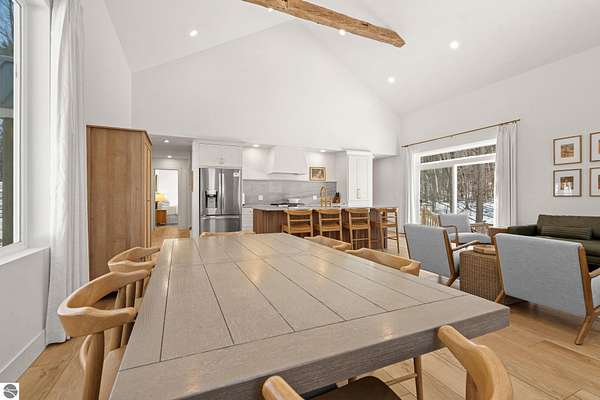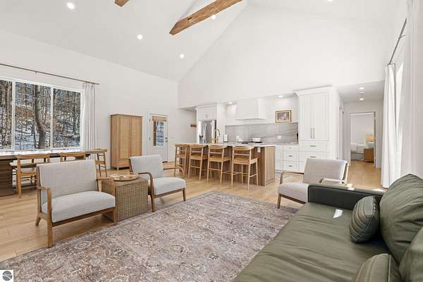 Tucked into a quiet wooded setting near the shores of South Lake Leelanau, this beautifully crafted four bedroom, three bath home, offers nearly 3,000 square feet of thoughtfully designed living space where natural materials and modern finishes come together. The main living area features soaring vaulted ceilings and striking reclaimed white pine beams dating back to the 1800s, creating a warm architectural centerpiece full of character and history. The kitchen showcases stunning Mykonos quartzite countertops and an open layout ideal for gathering and entertaining. The fully finished walkout lower level expands the living space with a second patio and additional room for guests, recreation, or relaxed evenings at home. Multiple outdoor areas provide peaceful spaces to enjoy the surrounding woods and Northern Michigan landscape. Set on an expansive 1.81 acre parcel made up of four separate lots, the property offers excellent long term flexibility. A future owner may choose to retain the additional lots for privacy or explore the potential to sell or develop them in the future. Built in 2025 with a high efficiency building envelope that includes spider insulation and natural gas service, delivering exceptional energy performance and low utility costs year round. Durable Hardie Board siding and quality craftsmanship provide lasting value and low maintenance ownership. Just a short walk from South Lake Leelanau, owners have the option to join the nearby Timberlee beach club, while the public launch at Paradise Cove makes it easy to spend the day on the water. The location offers a peaceful retreat while remaining conveniently positioned between Traverse City and the waterfront towns of Leland, Suttons Bay, and Glen Arbor. The home is being sold completely furnished and turnkey, allowing the next owner to step in and immediately begin enjoying everything Northern Michigan has to offer.
