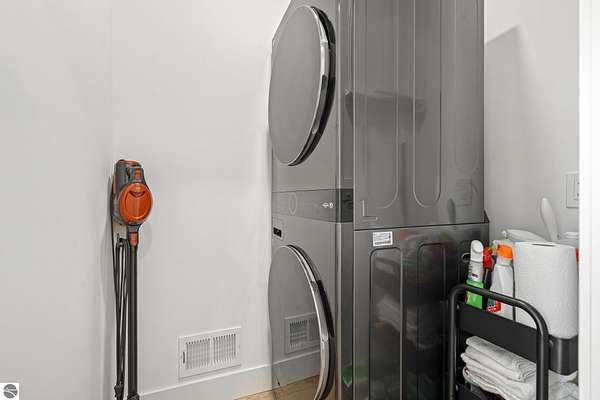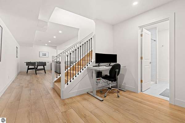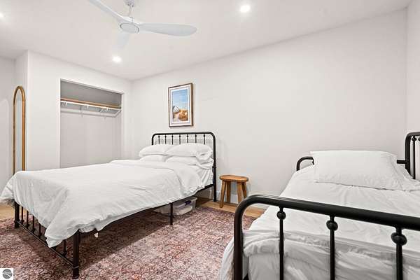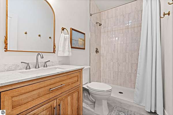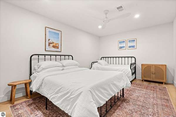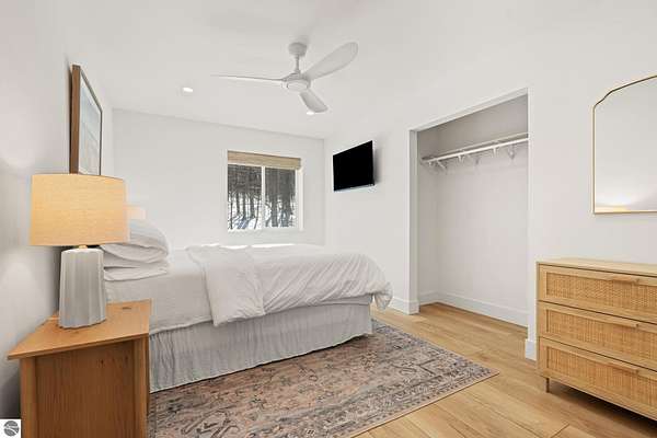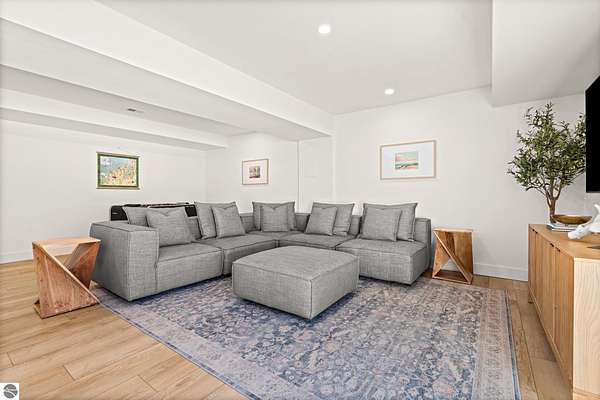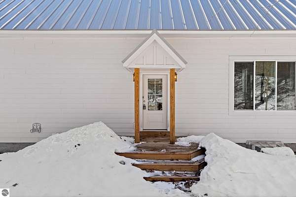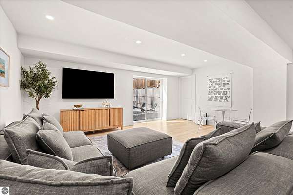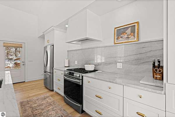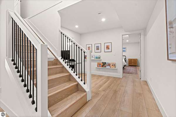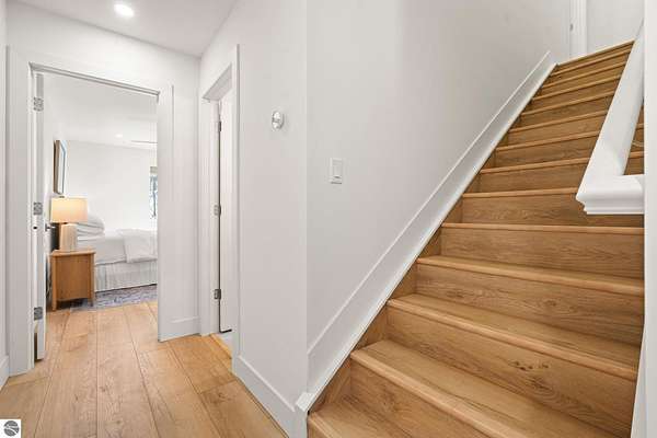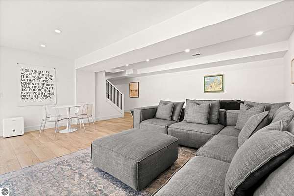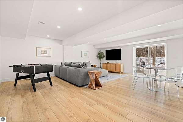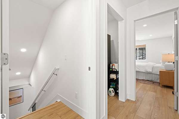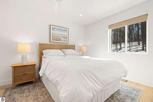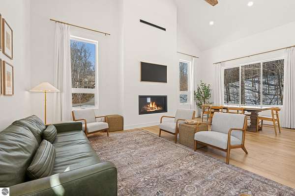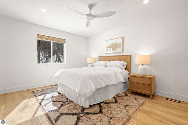 Tucked into a quiet wooded setting near the shores of South Lake Leelanau, this beautifully crafted four bedroom, three bath home, offers nearly 3,000 square feet of thoughtfully designed living space where natural materials and modern finishes come together. The main living area features soaring vaulted ceilings and striking reclaimed white pine beams dating back to the 1800s, creating a warm architectural centerpiece full of character and history. The kitchen showcases stunning Mykonos quartzite countertops and an open layout ideal for gathering and entertaining. The fully finished walkout lower level expands the living space with a second patio and additional room for guests, recreation, or relaxed evenings at home. Multiple outdoor areas provide peaceful spaces to enjoy the surrounding woods and Northern Michigan landscape. Set on an expansive 1.81 acre parcel made up of four separate lots, the property offers excellent long term flexibility. A future owner may choose to retain the additional lots for privacy or explore the potential to sell or develop them in the future. Built in 2025 with a high efficiency building envelope that includes spider insulation and natural gas service, delivering exceptional energy performance and low utility costs year round. Durable Hardie Board siding and quality craftsmanship provide lasting value and low maintenance ownership. Just a short walk from South Lake Leelanau, owners have the option to join the nearby Timberlee beach club, while the public launch at Paradise Cove makes it easy to spend the day on the water. The location offers a peaceful retreat while remaining conveniently positioned between Traverse City and the waterfront towns of Leland, Suttons Bay, and Glen Arbor. The home is being sold completely furnished and turnkey, allowing the next owner to step in and immediately begin enjoying everything Northern Michigan has to offer.