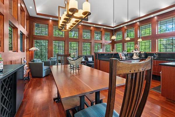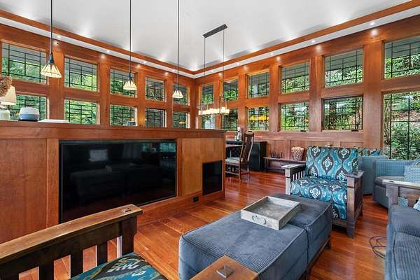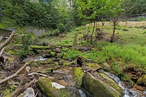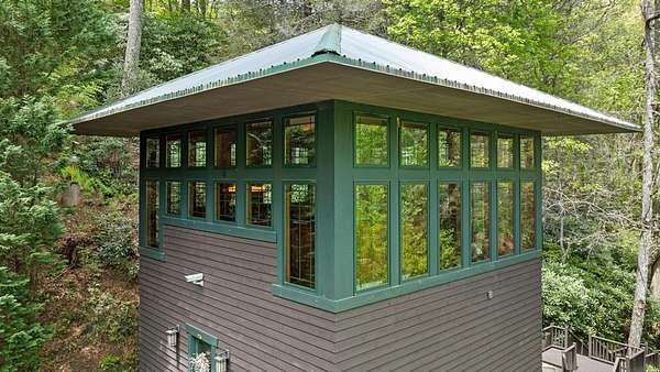 Welcome to "Secret Waters," a name that invites curiosity and promises enchantment. As you arrive, the magnificent tower house rises before you, complemented by the soothing sound of rushing waters. This exceptional residence features two remarkable elements: an architecturally designed tower house and a stunning natural wonder--a waterfall flowing gracefully beneath the home, creating a sanctuary that overlooks nature's spectacle. Every detail of this lavish residence has been meticulously crafted, showcasing exquisite cherry millwork, sleek granite surfaces, and expansive glass walls that offer breathtaking views. Venture outdoors to explore the enchanting grounds, where numerous bridges span the cascading waters, including a swinging bridge and a zip line. The unique site has served as the backdrop for countless weddings and events, generating an impressive social media presence that could lead to exciting opportunities for the savvy entrepreneur. With 5 acres of land available for additional accommodations, including a detached two-car garage, the potential is boundless. This Frank Lloyd Wright-inspired masterpiece is beautifully furnished for immediate luxurious living.