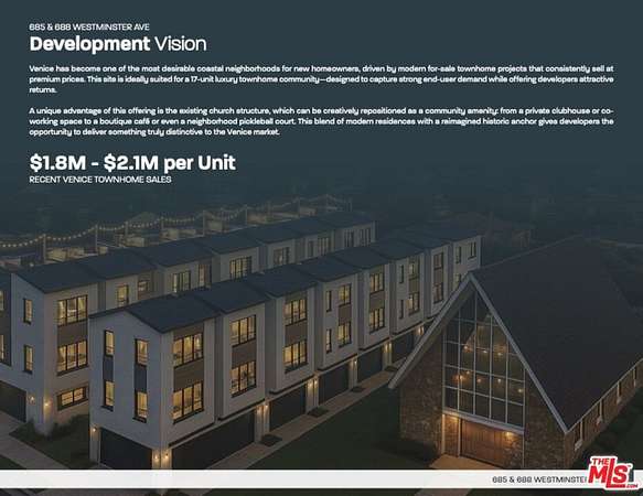 Est $49,423/moReimagining Venice Living with Scale and Style. This is an extraordinary opportunity to create a high-end townhome community in the heart of Venice, CA; a scale and vision rarely available in this market. Conceptual plan for 17 luxury townhomes. Anchoring the site is a distinctive A-frame church, a true neighborhood landmark ready to be reimagined. 12 units on 685 Westminster and 5 units on 688 Westminster.. Rare +/- 40,456 SF residential land sites west of Lincoln Boulevard supports multi-family or many other development options, buyer to perform all due diligence. 688 Westminster Apn# 4239-024-001is included in the sale and total site consists of 7 lots zoned LAR1.5 , Tier 3 TOC