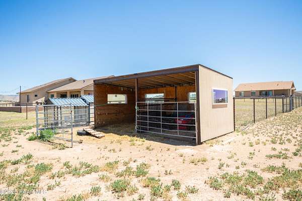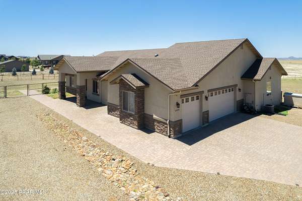 This meticulously cared-for, move-in-ready custom home offers the perfect blend of comfort, functionality, and serene country living. Set on 2 fully fenced acres and thoughtfully designed with over 2,600 square feet of single-level living space, this 4-bedroom, 2.5-bathroom residence is ideal for those seeking both style and practicality.From the moment you arrive, you'll appreciate the superior craftsmanship, attention to detail, and exceptional organization that make this property a true dream home. Soaring 10-12' ceilings, elegant recessed lighting, and high-quality Pergo TimberCraft Wheaton Oak waterproof flooring extend throughout the home, complementing its open, airy layout. At the heart of the home, the spacious living area features a striking rock wall fireplace and expansive windows that frame stunning mountain vistas and miles of unspoiled grasslands.The chef's kitchen is as beautiful as it is functional, outfitted with LG stainless steel appliances, granite countertops, a generous island, under-cabinet lighting, and an abundance of Knotty Alder cabinetry with soft-close hinges. A roomy walk-in pantry completes this dream culinary space.The private master suite is a tranquil retreat, complete with large picture windows, a luxurious walk-in closet, a spa-inspired garden tub, tile walk-in shower, dual vanities, and a private water closet.This home's split floor plan offers ample privacy and storage for every lifestyle. The fully insulated 3-car garage is perfect for hobbyists, car enthusiasts, or extra workspace.Outdoor living is just as inviting, with a large covered patio ideal for entertaining or soaking in the peace and quiet of your surroundings. The property is fenced and cross-fenced with durable no-climb pipe rail, creating three versatile zones ideal for equestrian use or hobby farming. A 2-stall stable, fenced pasture, and multiple gated access points ensure flexibility and ease of use.Additional features include:- RV hookups (power, dump station, and water) for convenient post-adventure clean-up- Upgraded insulation throughout- High-producing private well (tested at 13.3 GPM in 2022)- Low-maintenance paver walkways and landscapingTucked away nearly 300 feet from the main road via a private easement, this home offers both privacy and a peaceful, rural lifestyle yet remains part of a quiet, welcoming neighborhood.If you've been searching for space, comfort, and serenity in a move-in-ready home, this one checks all the boxes.