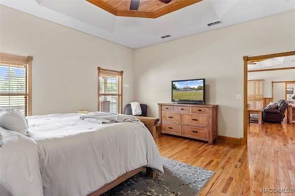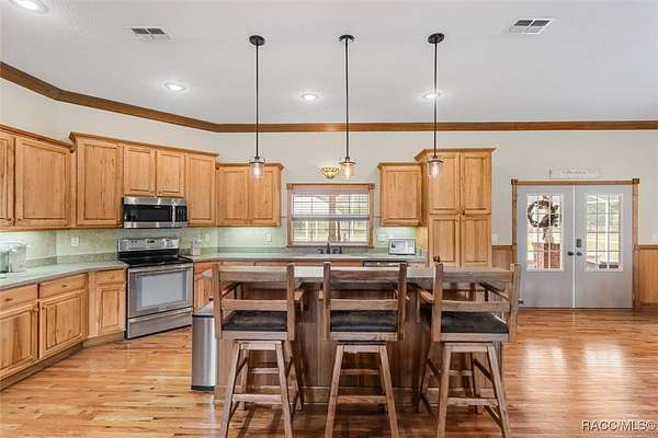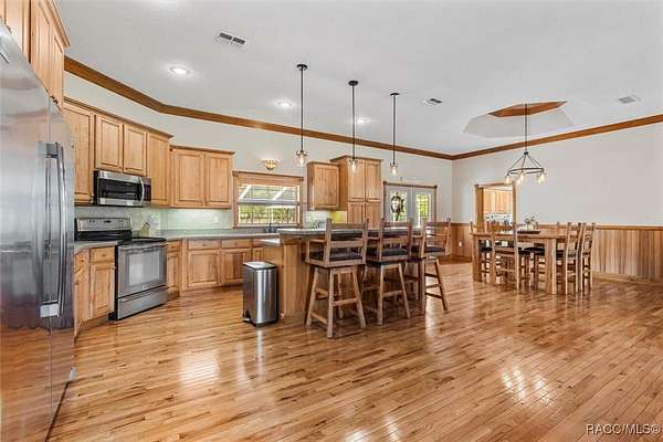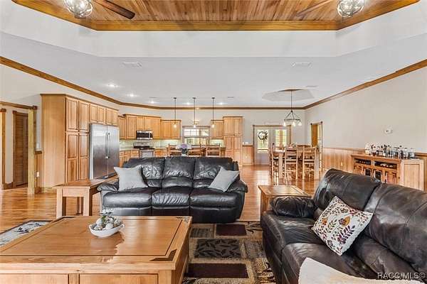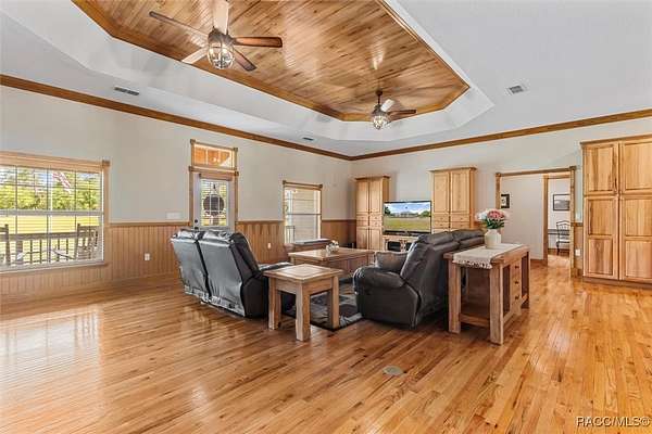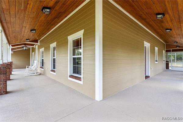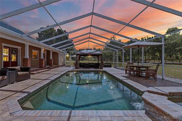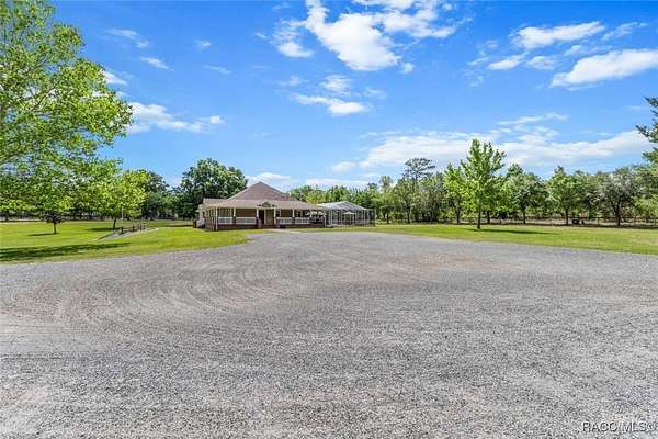 COUNTRY LIVING MEETS LUXURY WITH THIS GORGEOUS POOL HOME ON A 10 ACRE ESTATE IN BEAUTIFUL PINERIDGE FARMS! Welcome to this charming farmhouse in Pineridge Farms, a sought-after neighborhood in the heart of Florida's Nature Coast. No HOA & all the peace & quiet you could ask for! Bring your toys, animals, hobbies, & dreams of a laid-back lifestyle...this is the property for you! An ideal ranch-style home, complete with wrap-around porch & vintage screen door adding just the right touch of country charm. A rambling 2600sqft of liv. area features 4beds & 2baths. Common area of the home boasts a wide-open concept, anchored by a kitchen built for gathering, complete with huge island, breakfast bar, Corian counters & solid wood cabinetry. Gleaming hardwood floors throughout & tongue and groove pine in the tray ceilings. Large master ste & with room for a king bed & furniture, 2 walk-in closets & walk-in shower. Popular split floor plan with 3 guest rooms on the other side of the home ensuring privacy & relaxation. Speaking of relaxation, double doors lead to the massive screened-in back porch & pool area, where you can kick back by the glimmering saltwater pool, listening to the trickle of the spill over spa. Pool & spa heated with solar panels & electric heater, so it's swim season all year. After the day's work is done, pull up a rocking chair on the wraparound porch, listening to the gentle breeze through the trees. Massive detached garage with 3 bays (2 front/1 rear), office/gym (with mini split), full bath, its own 200-amp electric panel & separate septic. Also a steel 50x61 (approx.) pole barn, for trailers, boats, & RVs! ROOF in 2023, solar entry gate, whole-house wired for surround sound & security, & storm-safe laundry room with a dog wash station. Fully fenced & about 1/2 the property cleared & 1/2 left in its natural state. All of this in the heart of the Nature Coast, with access to fishing, hiking, hunting, biking, & recreation. This one's full of charm, space, & freedom-just waiting for you to call it home.