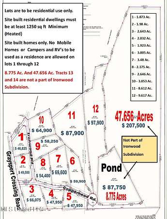 Grenada County MS. Here is your opportunity to own land within a few minutes of Grenada Lake, the town of Grenada, Dogwoods Golf Course and Grenada Lake State Park. The land has very easy access to all four. Grenada Lake offers world class fishing, boating, Skiing opportunities and much more. The town of Grenada has multiple stores for food, clothes, hardware, lumber, farm supplies and any needed necessities. Ironwood Subdivision is in the Gore Springs Community, East of Grenada, less than a mile from Hwy 8. This is a quiet area out in the country but not too far from the city. This is lot 11 of Ironwood Subdivision which is 8.612 +/- Acres. City water. Entergy Electric. The land is home site ready with dirt work completed. Lots are to be residential use only. Site built residential dwellings must be at least 1250 sq. ft. heated or greater. No Mobile Homes or campers and RV's used as a residence are allowed on Lots 1 through 12 Directions to the land - From the I-55 Grenada Exit 206 go East on Hwy 8 for 14 Miles to the Gore Springs Community (Yellow Caution Light at Intersection) Then left onto Graysport Crossing Rd. for 7/10 mi. to the Land on the Right. You will see the Land for Sale Sign on the right. Enter either of the 2 drives. to enter the subdivision. Lot number signs are on each lot for identification A close GPS address is 676 Graysport Crossing Rd. Gore Springs MS.