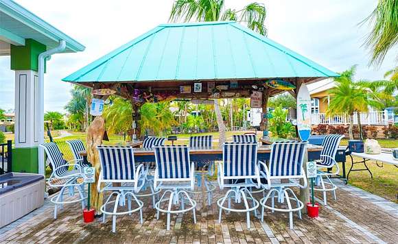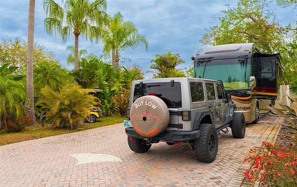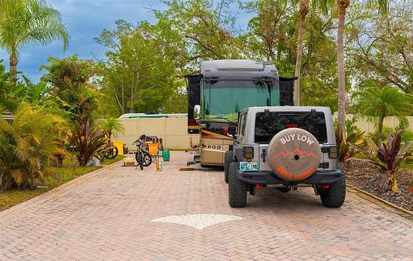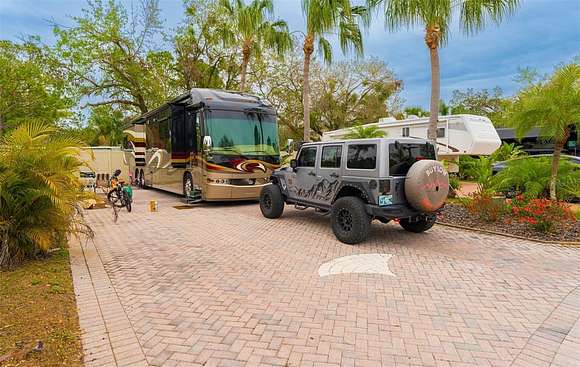 The lot is beautifully designed with brick pavers and surrounded by lush tropical landscaping with palm trees, creating an inviting and serene environment for relaxation or entertaining. This lot has a 100 amp full hookup and Verizon fiber optic is available at the street. Enjoy the community's resort-style amenities, including a clubhouse with two pools, a hot tub, tiki bar, and dog park--everything you need to unwind and socialize in a vibrant, welcoming atmosphere.