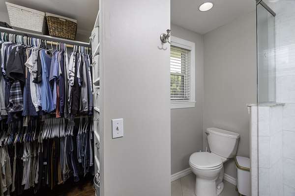 The primary suite invites relaxation with dual vanities, marble countertops, a spa inspired walk in shower with glass enclosure, elegant gray cabinetry, and a generous walk-in closet.