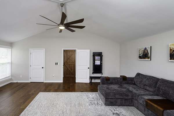 The open concept layout is highlighted by hardwood floors, crown molding, rustic barn doors, and exposed beams. A whole house backup generator provides added comfort and reliability.