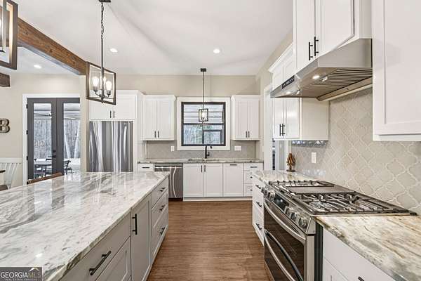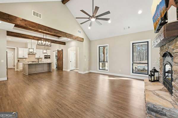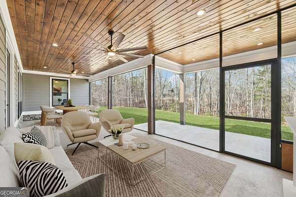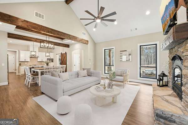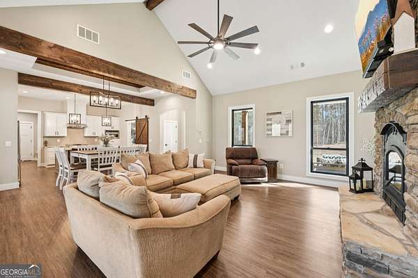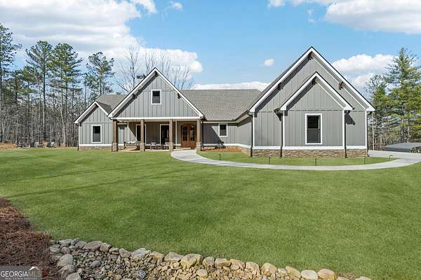 2023 Custom Home on 5 Private Acres + Primary Suite on Main + Screened Porch - Vaulted Great Room, Stone Fireplace, 3-Car Garage Bay + Expansion Potential Welcome to 687 River Highlands Rd, Dahlonega, GA-a rare North Georgia opportunity combining 2023 construction, 5 private acres, and a true Primary Suite on Main with the move-in-ready finishes buyers want. With 3 bedrooms, 2.5 baths, and ~2,262 sq ft, this home delivers modern mountain living with space to breathe-ideal for full-time living, a second home, or strong investment potential (buyers to verify any intended use and local requirements). Inside, the bright open layout is anchored by a vaulted great room featuring beam accents, wide-plank style flooring, and a striking stone fireplace-the kind of centerpiece that elevates both everyday comfort and entertaining. The kitchen is built to gather with white cabinetry, stone countertops, stainless steel appliances, and an oversized island flowing seamlessly into the dining area and living space. A dedicated home office/flex room adds the functionality today's buyers search for-perfect for remote work, hobbies, or overflow guest space. The primary suite on the main level offers the privacy and convenience buyers prioritize, paired with a spa-inspired bath featuring dual vanities, upgraded tilework, and a large glass shower. Two additional bedrooms share a beautifully finished full bath, plus a convenient powder room for guests. Outdoor living is the showstopper: relax on the expansive screened porch and additional covered patio overlooking peaceful wooded views-ideal for morning coffee, grilling, and evenings under the stars. The home also features a two-car garage plus an additional bay for a golf cart, toys, or workshop space, along with a large unfinished bonus/attic area ready for future expansion as a media room, 4th bedroom, gym, or storage. Private. Polished. Acreage. Primary on Main. Convenient to downtown Dahlonega, wineries, hiking, and access toward GA-400-this is the kind of North Georgia property buyers wait for. Disclaimer: All information deemed reliable but not guaranteed and should be independently verified. Photos & lot lines may be virtually staged to assist buyers in visualizing the property's potential. Contact the listing agent for more information or to schedule a private showing.