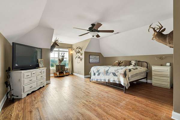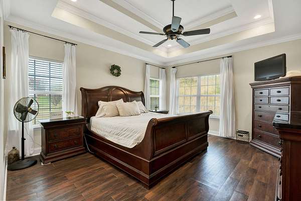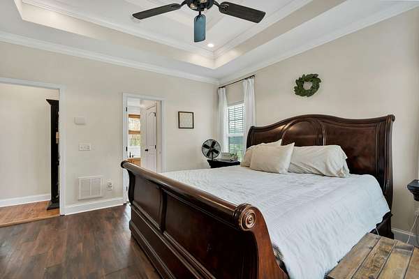 The primary suite on the main level is designed for privacy and ease, featuring great closet space and an easy-access shower. Upstairs, an additional master suite, office space, and secondary bedrooms provide flexibility for family, guests, or work-from-home needs.