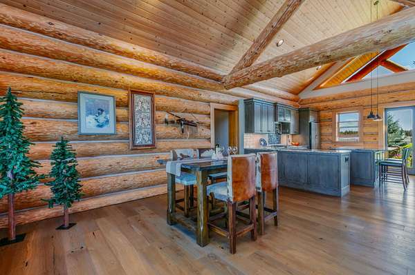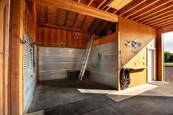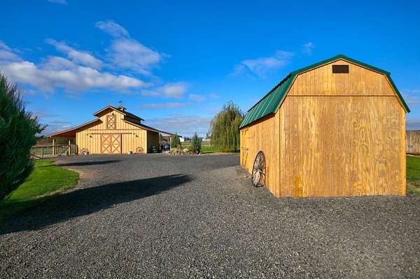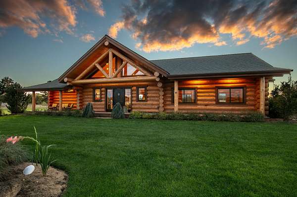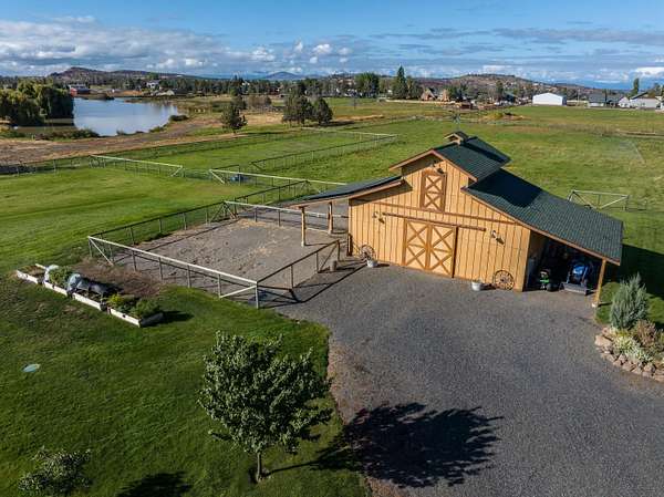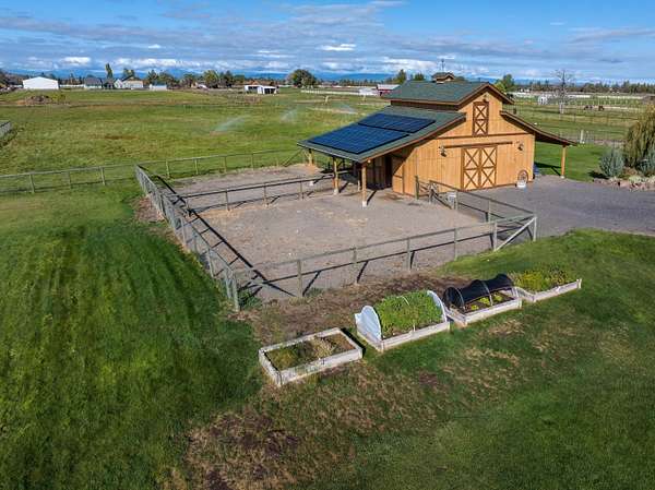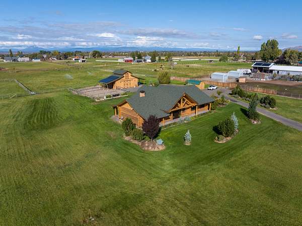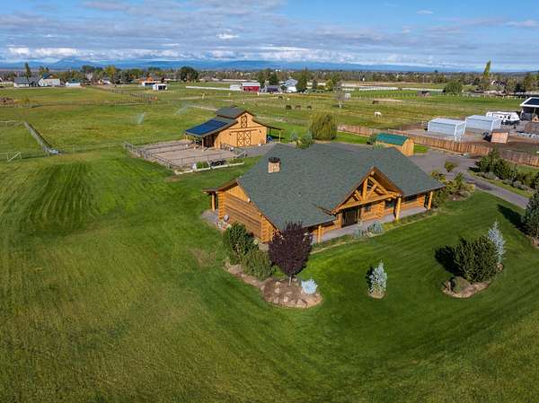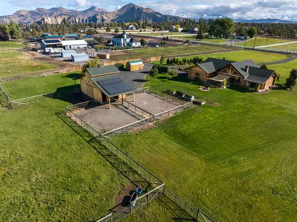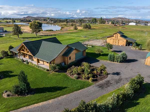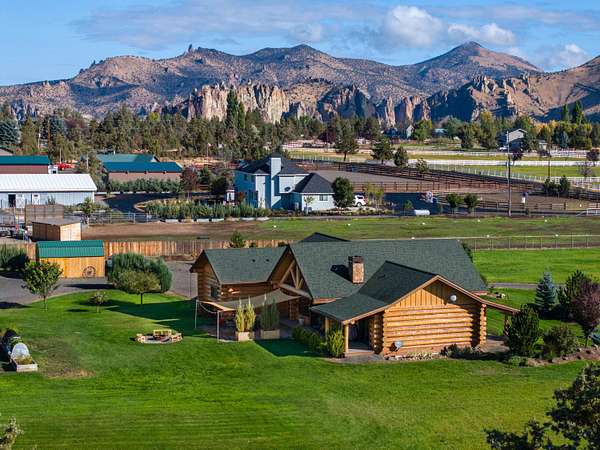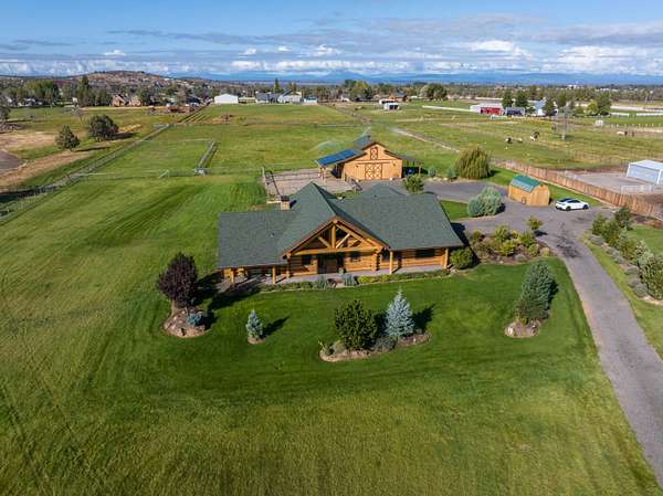 Discover your ideal Central Oregon property in the highly sought after Equestrian Meadows, suitable for horse lovers and those seeking a country lifestyle near Redmond, Oregon! This stunning, single-level log home offers comfortable, luxury living space on 6 acres+underground irrigation, & open, expansive views of the Cascade Mountains! This custom-built home features a fully-owned Solar System, Central Vac, private primary suite with French Door accesses to the back deck, and an impressive Great Room area with everyone's Dream Kitchen space! Upon property entry through the iron gate, you'll notice this gorgeously manicured estate, cross-fenced and complete with a 2 stall Barn + heated Tack room & Pasture. Property has plenty of room for privacy, storage, outdoor leisure w/ a Cozy Fire Pit, and space for animals. Soak in the scenery from the covered Trex front and back porches, perfect for relaxing or entertaining. Don't miss the RARE opportunity to live in this coveted neighborhood