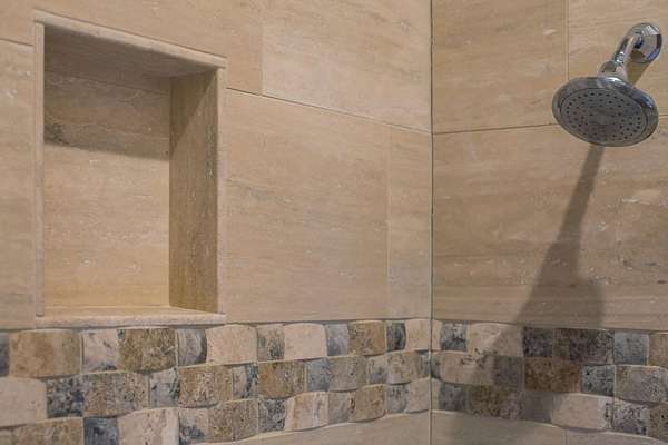 - Breakfast Bar, Built-In Features, Ceiling Fan(s), Central Vacuum, Granite Counters, Kitchen Island, Open Floorplan, Pantry, Primary Downstairs, Shower/Tub Combo, Solid Surface Counters, Stone Counters, Tile Shower, Vaulted Ceiling(s), Walk-In Closet(s)