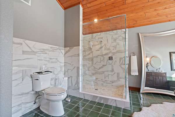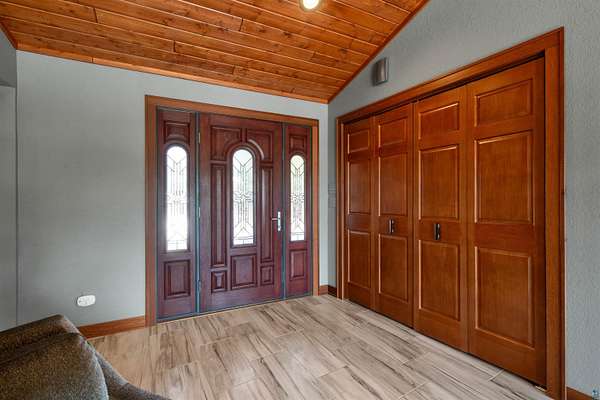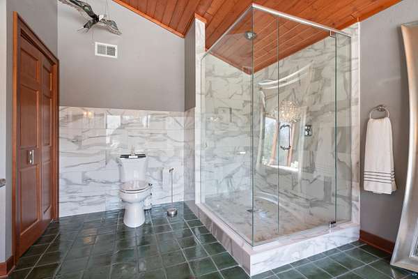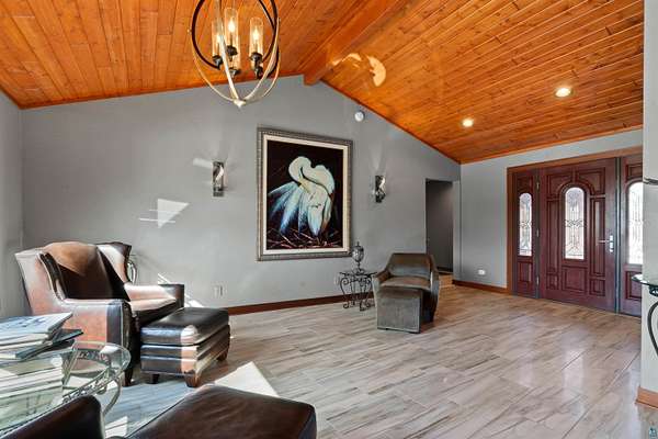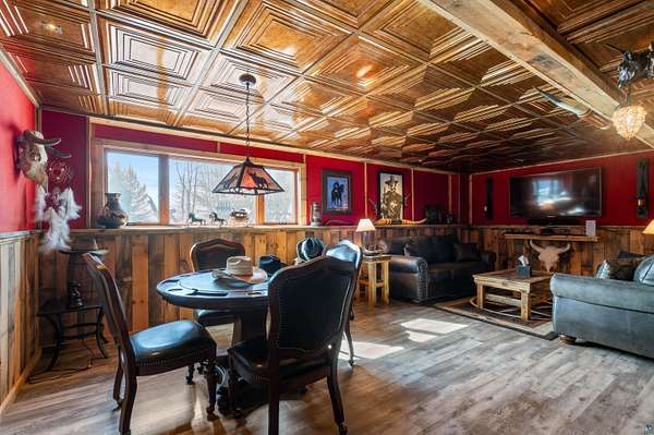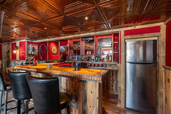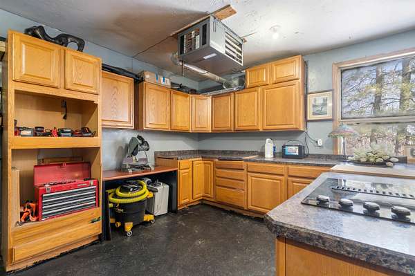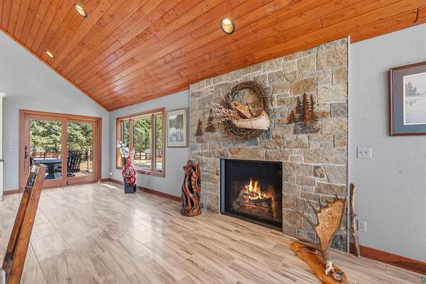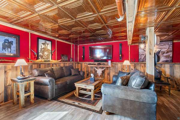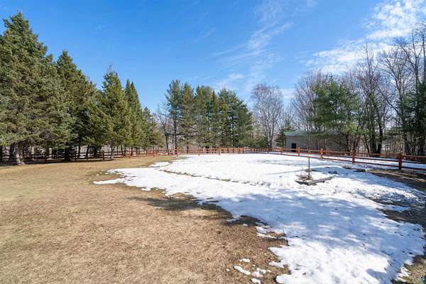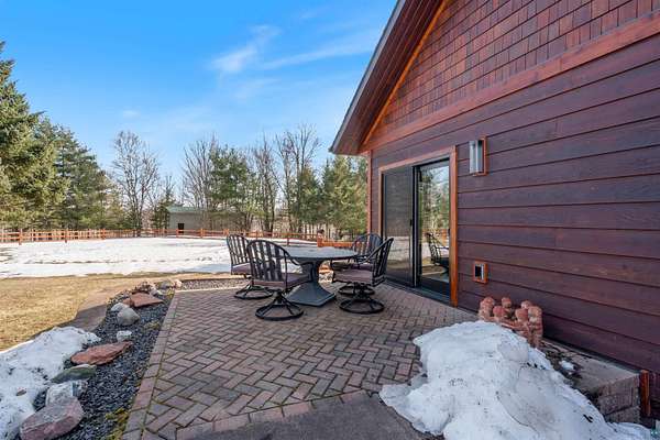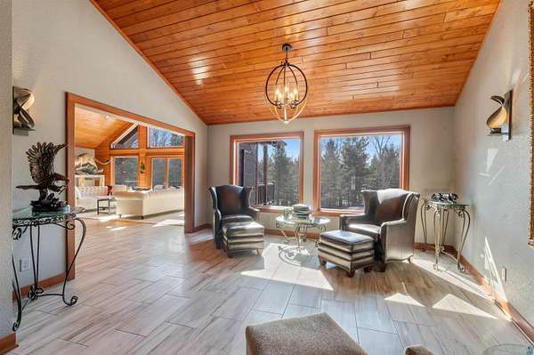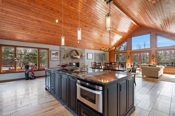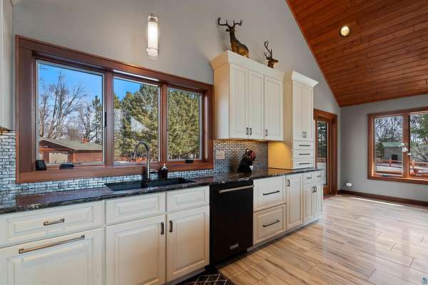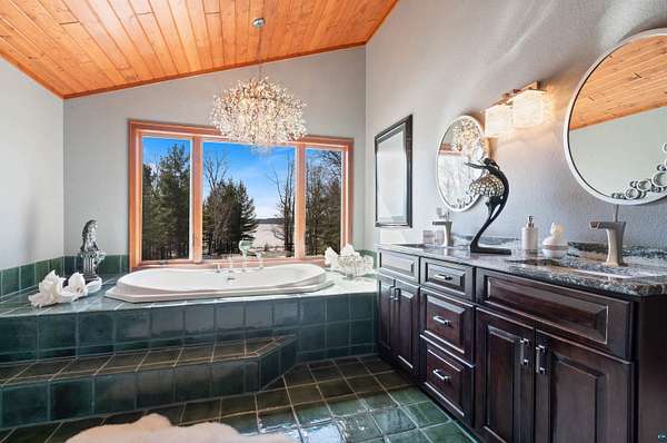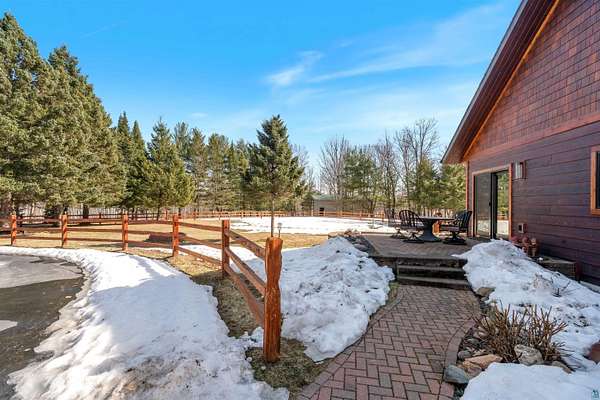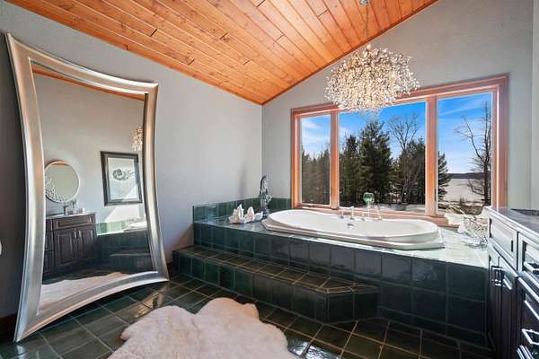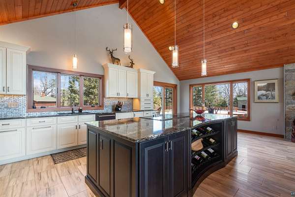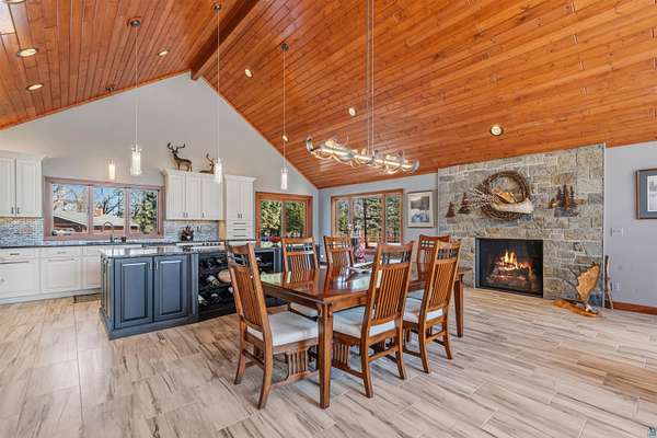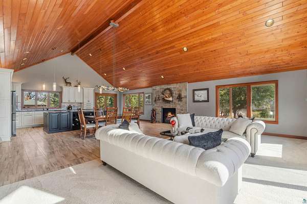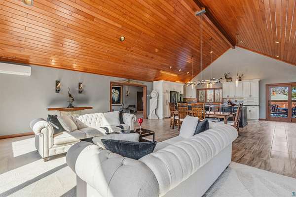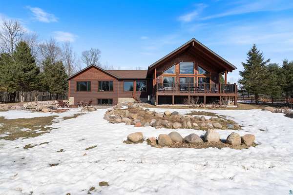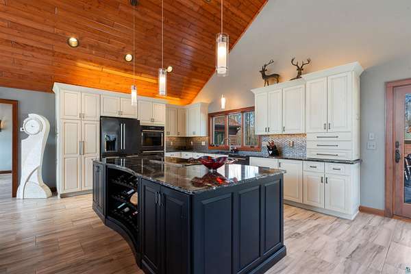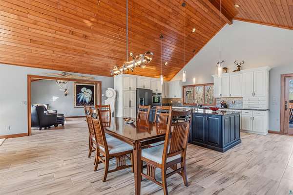 Absolutely Stunning and Utopic Ranch home situated on 5.5 acres with 600' +/- on Steele Lake! Serene, Private and Relaxing setting with wildlife right outside your door. Entering the home you will be struck by the rich custom finishes such as the Custom Azuliber Tile flooring, High Vaulted Tongue and Groove Ceilings, Custom Chandeliers, and the Custom designed kitchen. The professionally designed kitchen has Cambria Quartz Countertops, Glass Backsplash, and built in Wine cabinetry too! The adjoined living room provides Huge gazing windows overlooking the lake, a large stone fireplace, and a walk-out to the elevated deck. The main floor also hosts 2 bedrooms, with one being the AMAZING primary bedroom with a incredible en-suite bathroom providing an Italian Porcelain walk-in shower and an elegant Jacuzzi soaking tub. There is also a 3rd main floor bedroom that is currently used as a walk-in closet. Downstairs, the lower level is perfect for entertaining with it's Country Western theme with a full bar and poker table too. Outside, the home has a private driveway leading to a paved circle, a detached 2 car garage with finished area in back providing a kitchen that could also be used for entertaining. There is also a second garage on the property with a 12 foot door used for housing an RV and ATV. Outside: The grounds are wonderfully landscaped, there is a large fenced in area in the front yard, and another wrought iron fenced area off to the side. The back yard of the home features expansive views of the lake, an incredible sitting area surrounding the firepit, towards the lake there is a Gazebo with electric too. Some of the other notable features include: off peak electric, built in generator, back-up Steffes heat, In floor heat, a Double Oven, Mini-Split A/C's, circular driveway, and more. Impressive High End finishes, Privacy with 5.5 Acres sitting on hundreds of feet of Lake Frontage, Multiple Outbuildings, and an unmatched Private and Serene setting that you must see to believe!