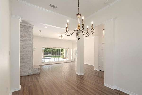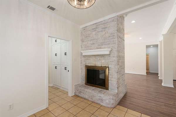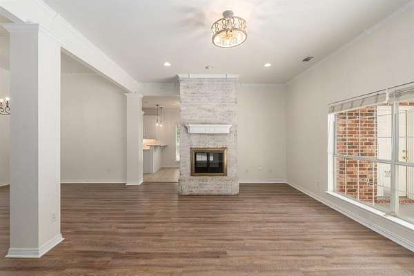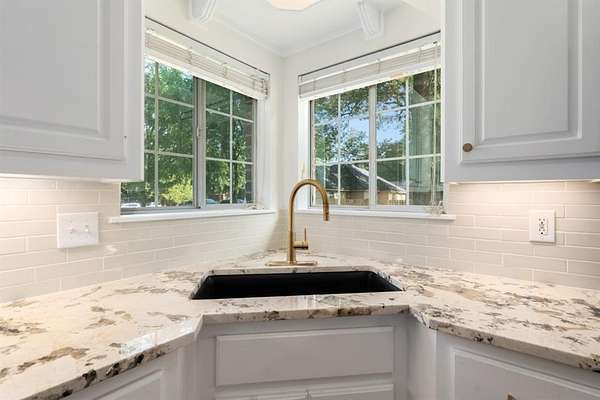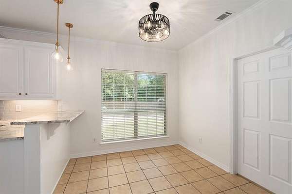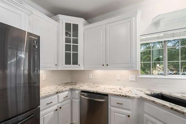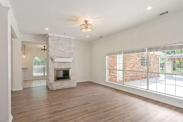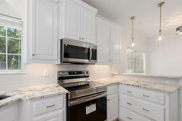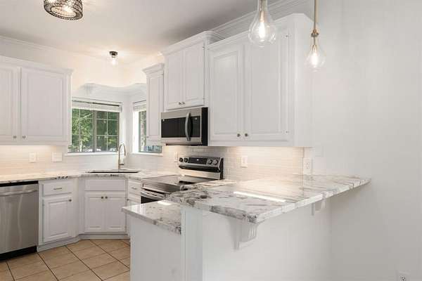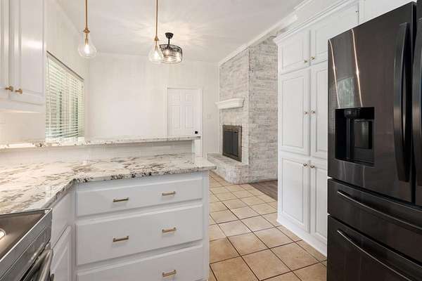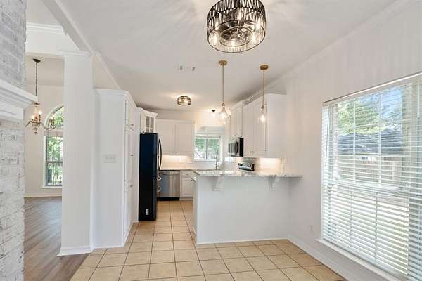 The 3-bedroom, 2.1-bath brick home has been updated with fresh interior paint, designer lighting, and a reimagined kitchen featuring stone countertops and stainless appliances. The open-concept layout enjoys natural light and showcases clean, modern finishes throughout.