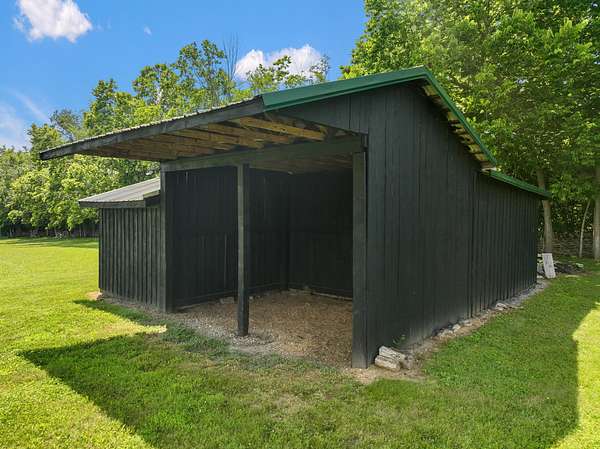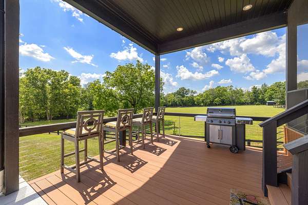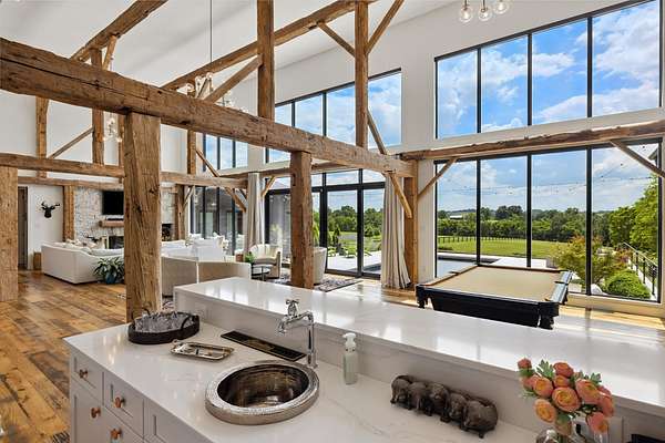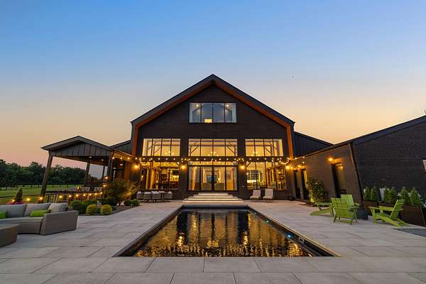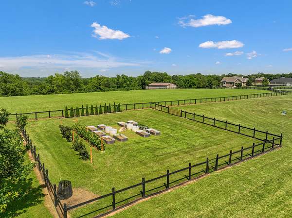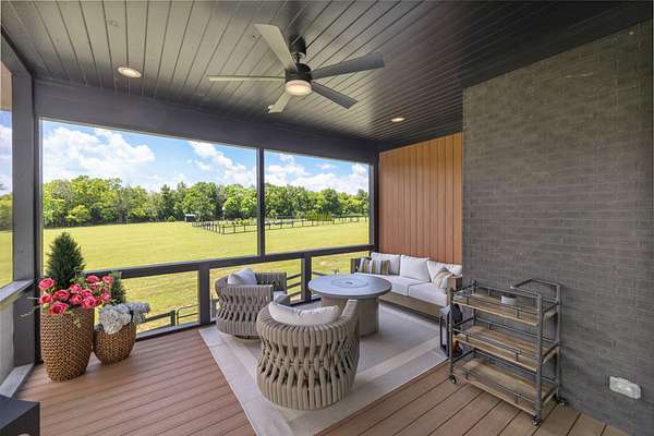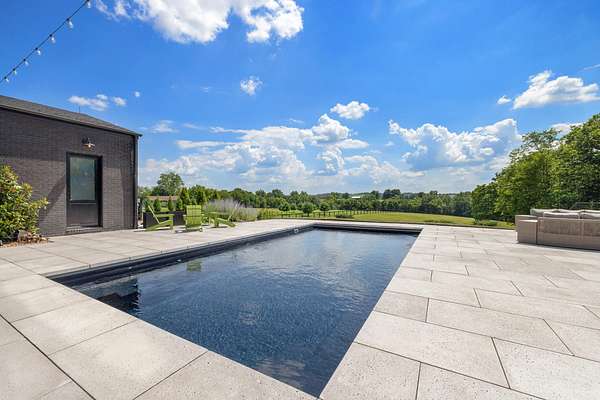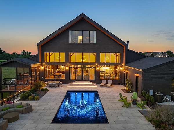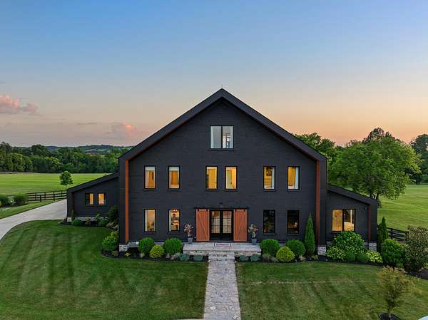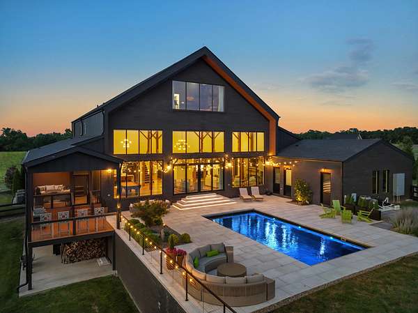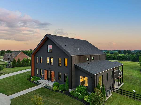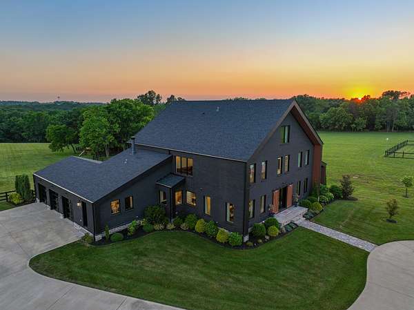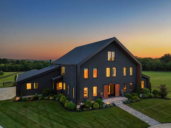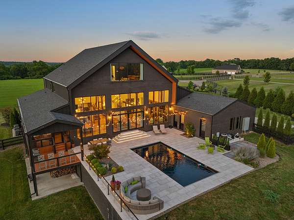 Your dream Kentucky estate awaits. Wake up to panoramic views of rolling pastures, unwind by the pool as the sun sets over your land, and enjoy the privacy of a true countryside retreat. Situated on 10.49 fully fenced acres with classic limestone fencing, this property offers a picturesque setting just minutes from town. Featured in Kentucky Homes & Gardens, this 5-bedroom, 4 full bath, 1 half bath home blends Scandinavian-inspired design with warm, inviting finishes. Expansive floor-to-ceiling glass fills the home with natural light while capturing breathtaking views, complemented by automatic shades. Upon entry, a custom wood herringbone foyer is flanked by a private office and formal dining room. The main living area features a striking fireplace and dramatic wall of glass, flowing seamlessly into the chef's kitchen with an oversized island, built-in breakfast nook, and dual pantries. Additional main-level highlights include a custom bar with kegerator and beverage fridge, a spacious laundry room, and a half bath. Accordion glass doors lead to a screened porch, creating seamless indoor-outdoor living. The first-floor primary suite offers stunning views, a spa-like bath with power shades, and a custom walk-in closet. The second floor includes a built-in bunk room, dedicated movie room, additional flexible living spaces, two bedrooms, and a full bath. The third-floor guest retreat features a private bedroom, full bath, and viewing area. The finished lower level adds another bedroom, full bath, a second family room, and extensive storage-ideal for a home office, gym, or additional living space. Outdoor living is equally impressive with a screened-in porch, grilling area, and a fiberglass pool with automatic cover, lighting, pool bath, and storage. A fully fenced garden includes established blackberry, raspberry, strawberry, and asparagus beds. A spring-fed creek runs through the property, surrounded by black walnut trees and abundant wildlife, and the home backs to a scenic sheep farm for added privacy. Additional features include black brick exterior, Trex decking, geothermal system on the main level, multiple HVAC units with 5-zone app control, whole-home UV air and water purification, dehumidification system, radon mitigation, lightning rods, advanced drainage system, Ring security, and Starlink internet. Adjoining 17.96-acre parcel available. No formal HOA with light restrictions. Furnished option available.