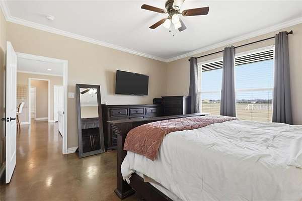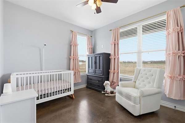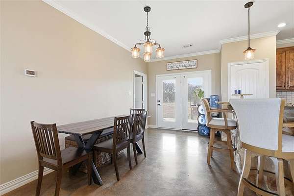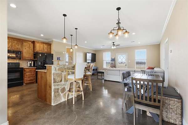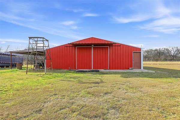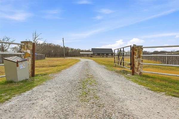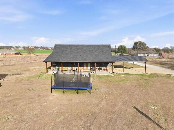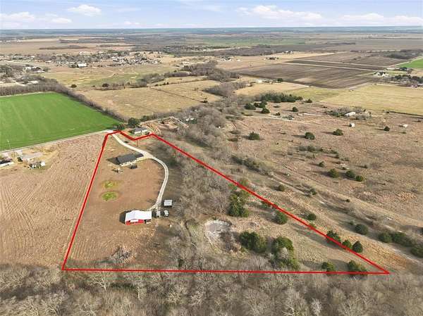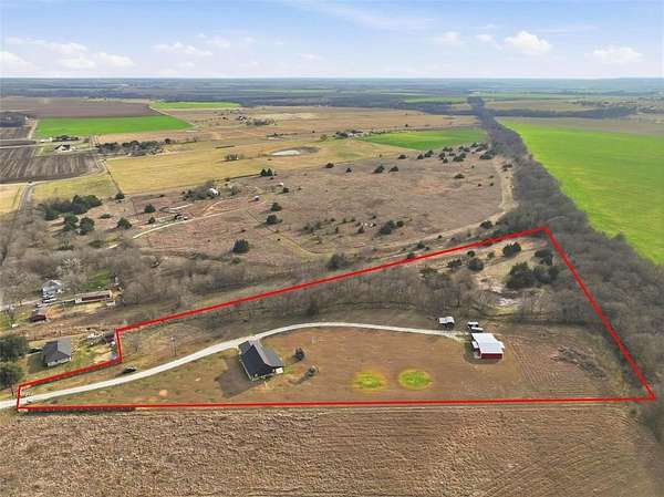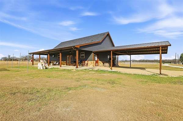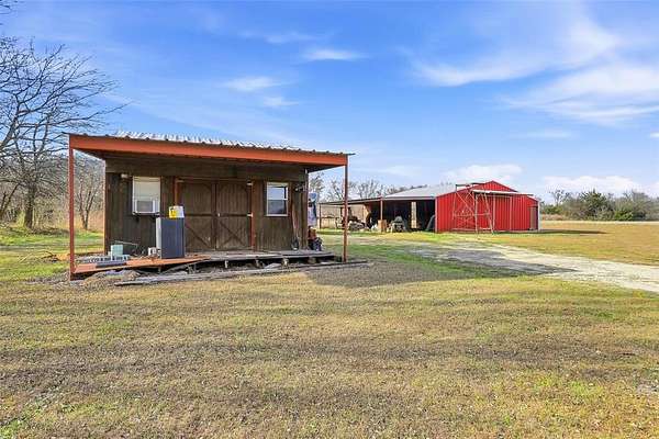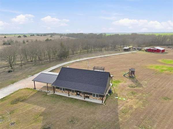 Peaceful country living awaits on just under six acres with room to roam and endless possibilities. This charming home features expansive covered front and back porches overlooking open pasture and mature trees, perfect for enjoying quiet mornings and wide-open Texas skies. Inside, the open-concept floorplan offers durable, low-maintenance concrete floors and a warm, rustic kitchen highlighted by a rock-accented island-breakfast bar, wood cabinetry, granite countertops, and ample prep space ideal for entertaining or a dedicated coffee bar. The property includes an insulated 30x38 barn-shop, ideal for equipment, hobbies, or livestock needs, along with additional outbuildings and a tank-pond on site. With plenty of space for small farm animals, gardening, or adding a pool, this property delivers true versatility. Conveniently located just off I-35 with easy access to Hillsboro, Waxahachie, and Corsicana, this is country living without sacrificing connectivity.