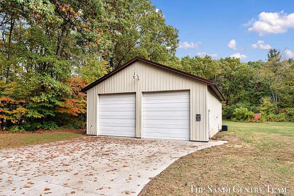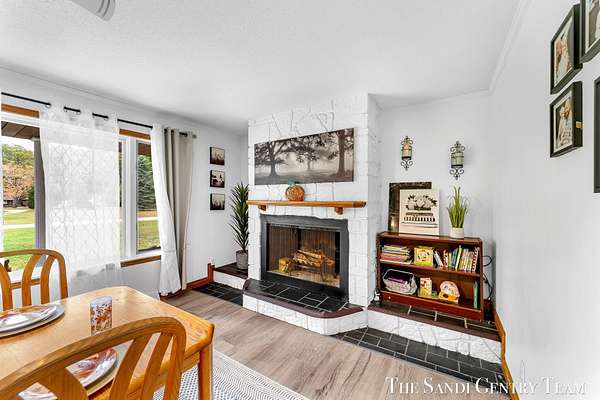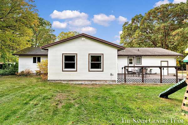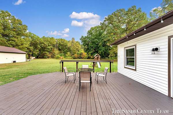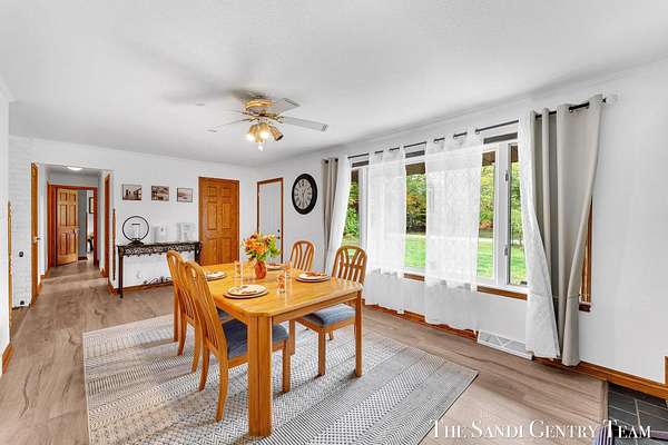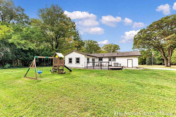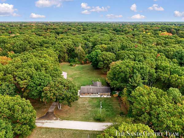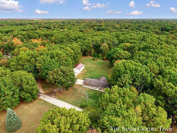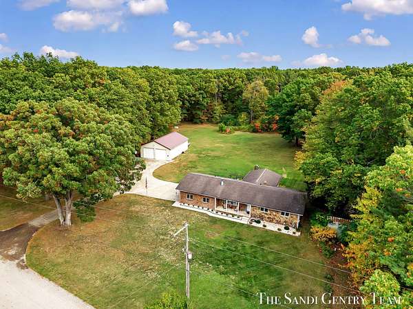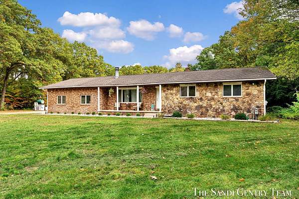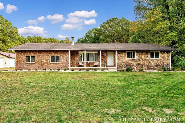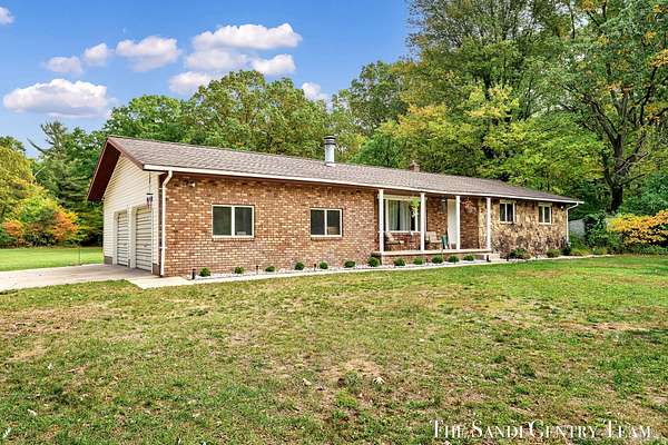 Discover the perfect blend of privacy, space, and convenience with this serene ranch home set on nearly 5 acres surrounded by nature and mature trees. Enjoy peaceful views, your own hiking trails, and a large heated pole barn with electric, water, and a drive-through door ideal for storage, hobbies, or a workshop. Inside, this sprawling 3-bedroom, 1.5-bath home offers comfortable main-floor living. The spacious living room features a cozy fireplace, while the open kitchen and dining area make entertaining effortless. A large den with sliding doors opens to the back deck the perfect spot to take in the tranquil setting or host family and friends. The full basement provides endless possibilities from ample storage space to the potential for additional living areas, a home gym, or recreation room. Recent updates include newer flooring, appliances, some windows, and electrical improvements, providing modern comfort and peace of mind. Conveniently located near Spring Lake and with easy highway access, this home combines quiet country living with nearby amenities.