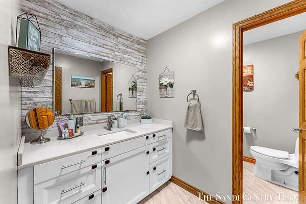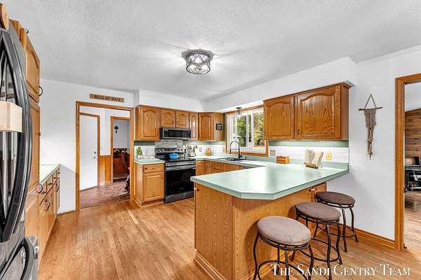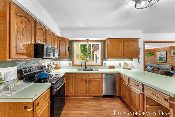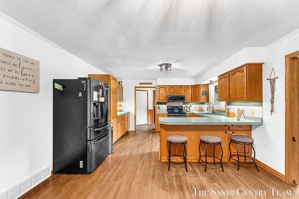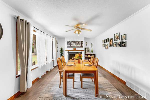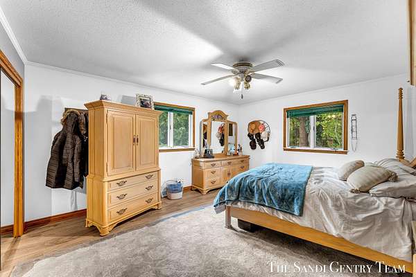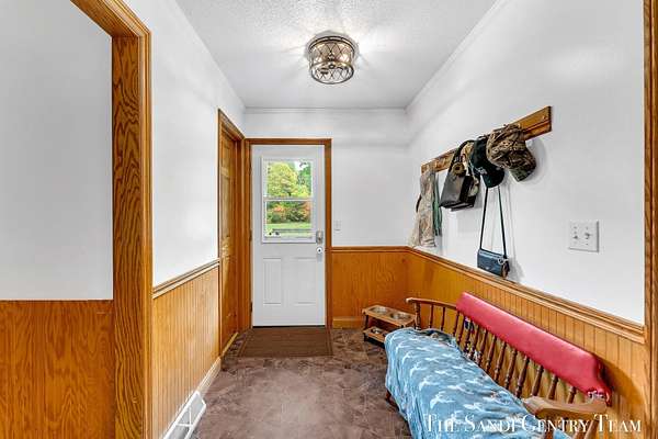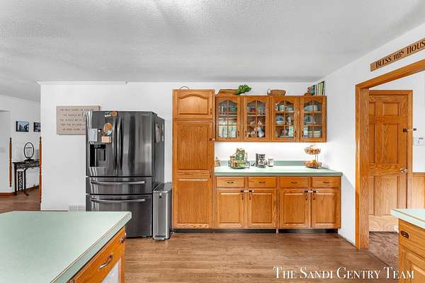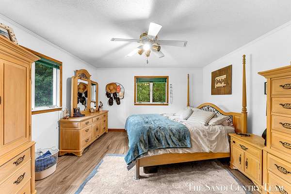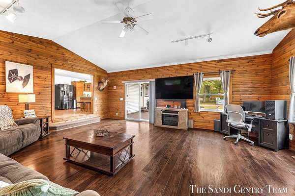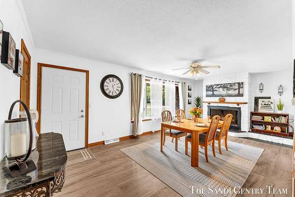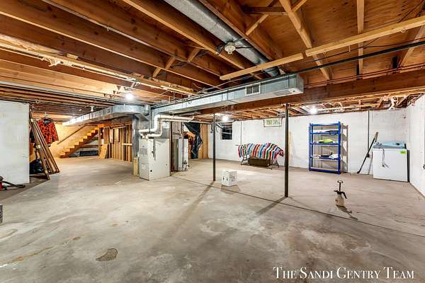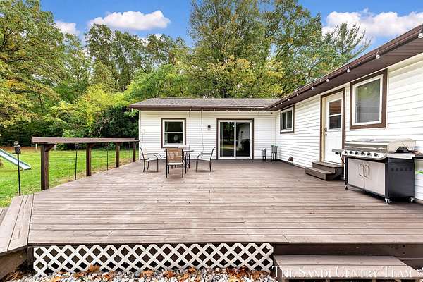 Discover the perfect blend of privacy, space, and convenience with this serene ranch home set on nearly 5 acres surrounded by nature and mature trees. Enjoy peaceful views, your own hiking trails, and a large heated pole barn with electric, water, and a drive-through door ideal for storage, hobbies, or a workshop. Inside, this sprawling 3-bedroom, 1.5-bath home offers comfortable main-floor living. The spacious living room features a cozy fireplace, while the open kitchen and dining area make entertaining effortless. A large den with sliding doors opens to the back deck the perfect spot to take in the tranquil setting or host family and friends. The full basement provides endless possibilities from ample storage space to the potential for additional living areas, a home gym, or recreation room. Recent updates include newer flooring, appliances, some windows, and electrical improvements, providing modern comfort and peace of mind. Conveniently located near Spring Lake and with easy highway access, this home combines quiet country living with nearby amenities.