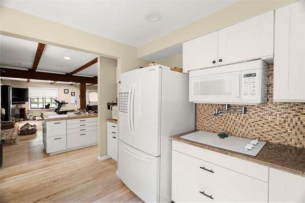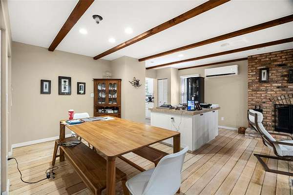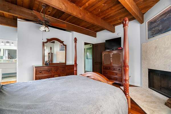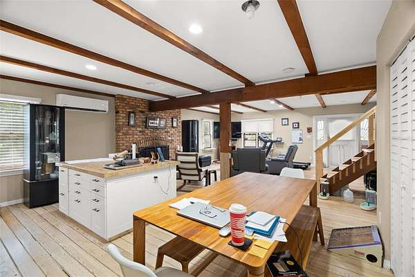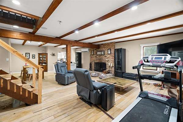The existing two story home was originally designed to reflect a classic farmhouse, featuring exposed cedar beams, tongue and groove wood flooring, and a warm, timeless feel throughout. The main level includes a spacious living area, dining space, kitchen, and laundry. There is also an attached in law suite with its own entrance, living room, bedroom, bathroom, walk in closet, and kitchenette. This setup works well for extended stays or flexible living.