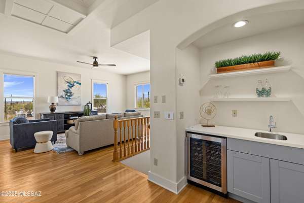 Discover the perfect blend of tranquility and functionality on this expansive 3-acre estate, offering stunning panoramic views of the desert and Catalina mountains. Whether you're seeking a private sanctuary or versatile property for entertaining and guest accommodations, this home has it all! Main house offers a spacious layout with wood burning fireplace in living room, brand new carpet and plenty of windows to take in the view. Kitchen has brand new solid surface counters. Primary offers large walk in closet and full bath. Upstairs features beautiful hardwood floors, family or loft area, a wet bar and 2 additional bedrooms with a full bath. Grab a cold one from the wet bar and wine fridge to take outside on the upper deck and take in those amazing Tucson sunsets. Guest house features Brand new roof shingles on main house!