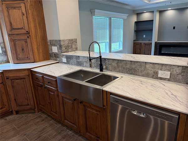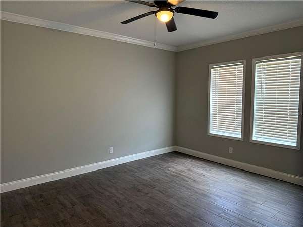 - Built-In Features, Ceiling Fans(s), Crown Molding, Eat-In Kitchen, High Ceilings, Open Floorplan, Primary Bedroom Main Floor, Solid Surface Counters, Solid Wood Cabinets, Split Bedroom, Thermostat, Tray Ceiling(s), Walk-In Closet(s)