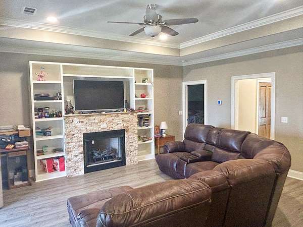 - Blinds, Ceiling Fan(s), Fireplace-Gas, French Doors, Furnishings, Walk-In Closet(s), Workshop