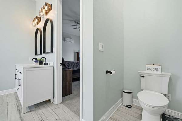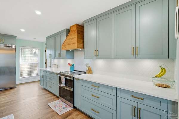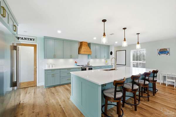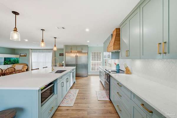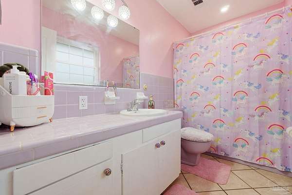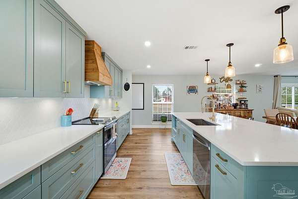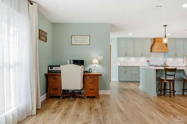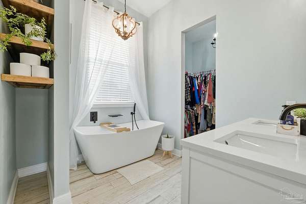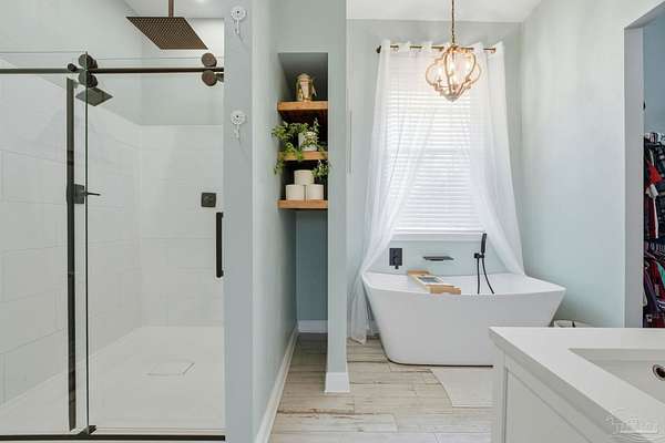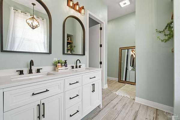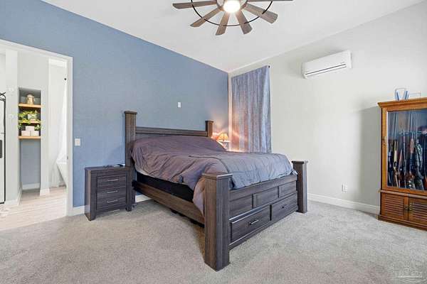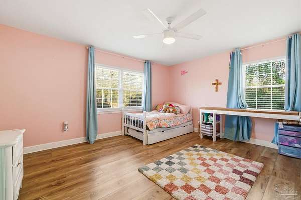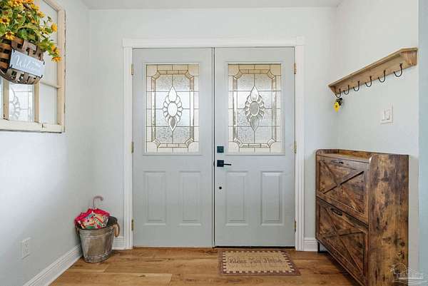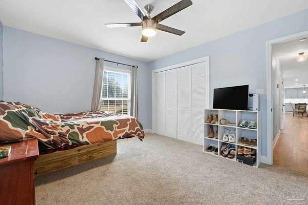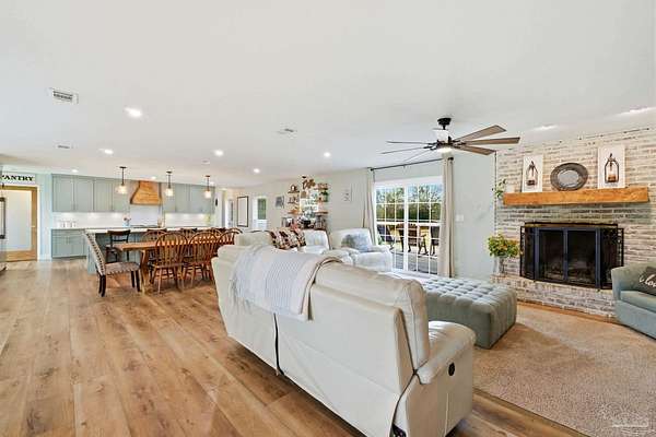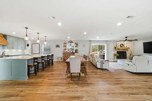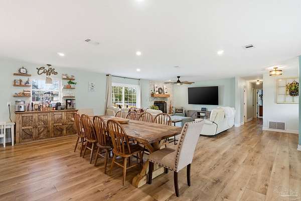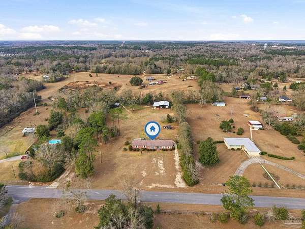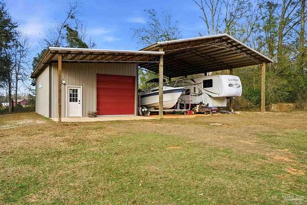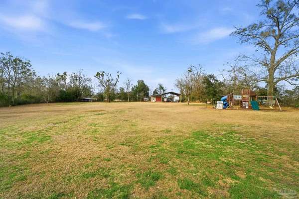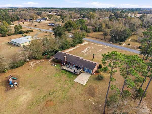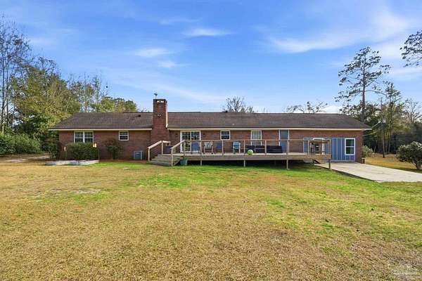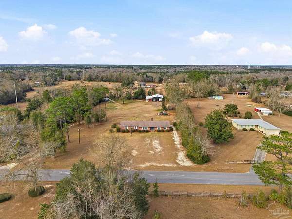 Welcome to this spacious 4-bedroom, 3.5-bathroom home situated on an expansive 3-acre lot in beautiful Cantonment. This property features a well-thought-out split floor plan that enhances the flow of the living spaces, making it ideal for both family living & entertaining. The heart of the home is undoubtedly the chef-inspired kitchen, equipped with soft-close cabinets, stainless steel appliances, quartz countertops, a large island, & a pantry featuring custom shelving. A stunning vent hood accentuates the kitchen's design, while the adjacent dining area provides a perfect space for casual or formal meals. One of the standout features of this home is the converted garage, transformed into a private main suite. This unique space is entered through a step-down design that creates a sense of seclusion. The ensuite bathroom is a luxurious retreat, boasting a walk-in shower with dual shower heads & a rain head, a separate freestanding garden tub, dual vanities, & a large walk-in closet. The main living area showcases a wood-burning fireplace surrounded by beautiful brickwork, adding warmth & character to the space. All of the bedrooms are spacious, with one that can double as a second primary bedroom as it has its own ensuite bathroom. The outdoor space is equally impressive, featuring a large open deck perfect for outdoor activities & relaxation. The large barn which features a 20'x48' enclosed workshop offers additional storage solutions, ensuring you have the space needed for all your outdoor equipment & projects. Recently updated, the full bathroom includes a new vanity, flooring, shower, and stylish wallpaper, making it both functional and aesthetically pleasing. A convenient half-bath off the laundry room features trendy barn doors and a pocket door for easy accessibility. This property not only offers ample living space but also the tranquility of expansive grounds. Schedule your showing today to explore this exceptional opportunity to own this beautiful home.