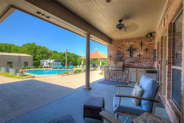 Resort-caliber amenities abound: a freshly replastered pool complemented by a 20'×20' copper-roofed cabana with Bluetooth audio, four raised-bed gardens for the culinary gardener, and an outdoor living area with dedicated LP service for grilling and fireside evenings.