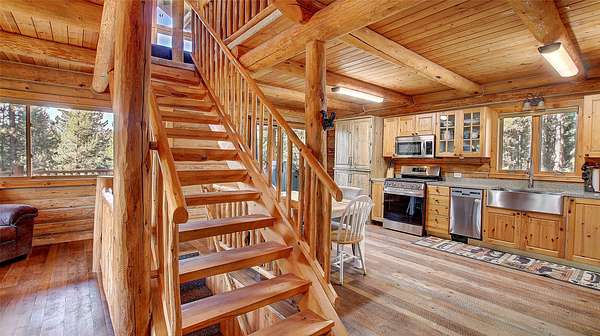 Private, well-maintained Montana property with two distinctive log homes on 10+ hilltop wooded acres in the picturesque Swan Valley. There are no covenants and no homeowners association. The primary residence offers 1594 sq ft of living space over three levels, including a modern kitchen with solid surface countertops and stainless appliances. The main level has rough sawn wood flooring throughout, and a large deck off the back offers space for entertaining and outdoor gatherings. The primary bedroom with newly renovated bath on the top floor offers majestic views of both the Swan and Mission Mountains from the two decks or through the floor to ceiling windows. The walkout basement features space for a 2nd bedroom or an office/craft room and includes a full bathroom as well as the laundry/mechanical areas. The home is heated by a free-standing propane stove in the living room, a propane wall heater in the basement, and electric baseboard heating upstairs. The second log home offers 898 sq ft of living space with a main floor bedroom and bathroom, living room, an eat-in kitchen, and a loft. The home features a wrap-around deck for outdoor enjoyment. Primary heat is provided by a freestanding wood stove in the living room with electric baseboard heat for backup. This second home is currently rented for additional income and is being sold furnished. Additional amenities include a 36' X 24' detached garage with heated workshop area and a large all-season greenhouse. Both homes and the garage are connected to a whole house generator system. The driveway is gated, and the property is fenced. 690 Swanland Drive offers quiet seclusion while providing easy access to highway 83 and community amenities such as post office, community hall, library, gas station and grocery store. Glacier National Park is just two hours away. This property is also listed as a single family package with a rental. Cross refer to MLS #30060451.