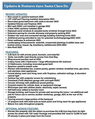 - Addl Land Available, Fenced Lot-Part, Flood Insurance Req, Lawn Pump, Patio Covered, Summer Kitchen, Within 1/2 Mile to Water, Yard Building