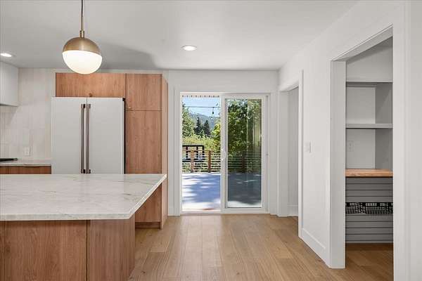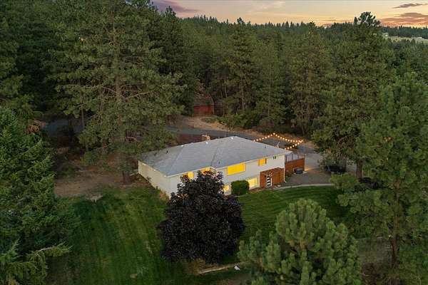 Views and Privacy!! This stunningly completely renovated home on 3 treed acres, minutes from Spokane's South Hill, blends function + beauty. The kitchen boasts Taj Mahal Quartzite counters, an oversized island for 8, GE Cafe appliances, abundant cabinetry w/ Emtek hardware, walk-in pantry, + portrait window. The main living area features vaulted ceilings, a gas fireplace, + beautiful views. The spa-like primary en-suite w/ organic style, rainfall shower + tub. 2 more bedrooms, a full bath w/ terrazzo tiled shower, + guest bath complete the main level. The lower level - secondary living room, 4th bedroom, office, laundry w/ double washer/dryer, + mudroom. Drought-resistant landscaping, new sprinkler system, chicken coop, barn + daily deer sightings enhance country living. Trader Joe's and Target minutes away, but on a private drive your only visitors are your Amazon delivery + the friends you entertain! Steps from Glenrose trailhead, evening strolls with incredible sunsets are in your f