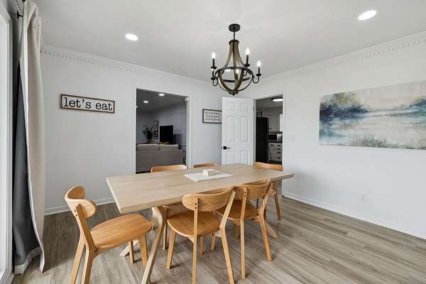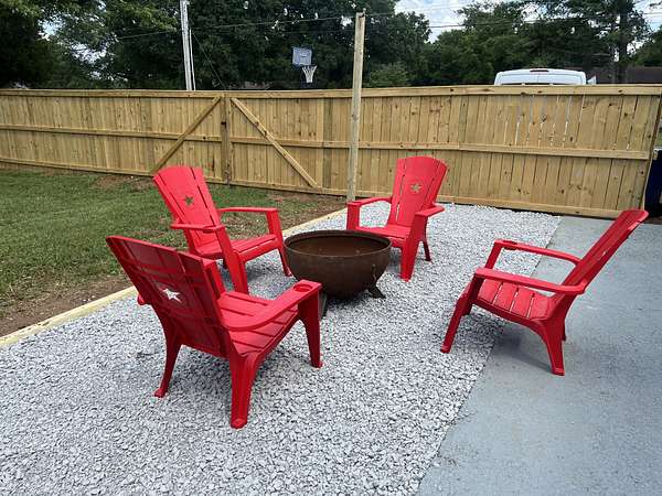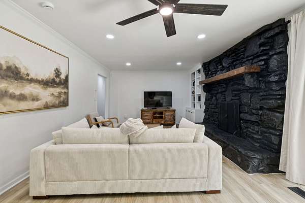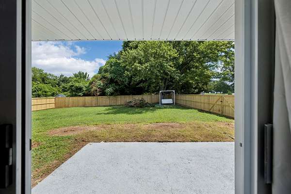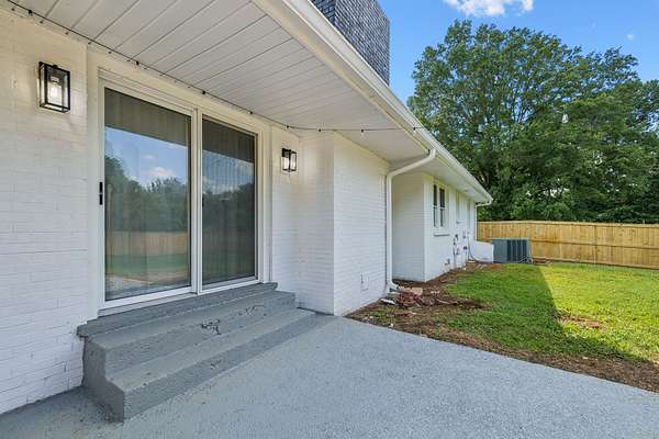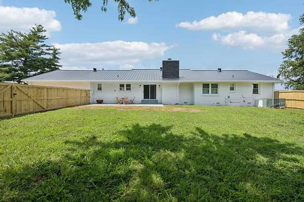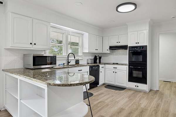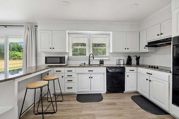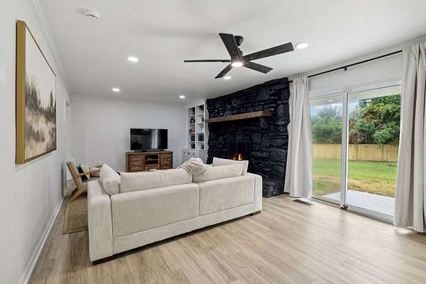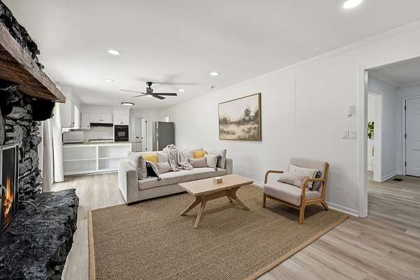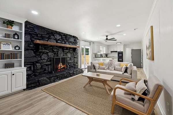 Inside the home, enjoy light-filled, living spaces, fresh new finishes & a functional, one-level layout. With formal living room featuring nice trim work and modern lighting, while a second den adds cozy character with a painted stone fireplace and easy backyard access. The kitchen pairs charm and practicality with white cabinetry, granite countertops, and stainless steel appliances.