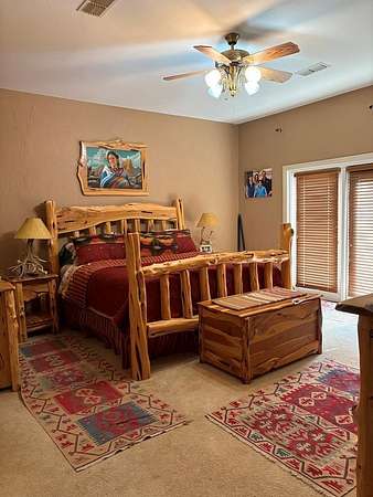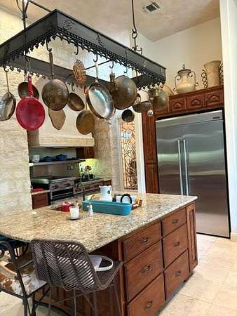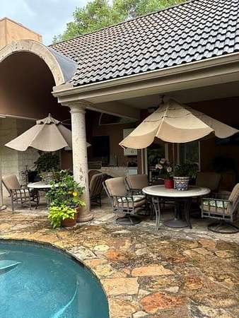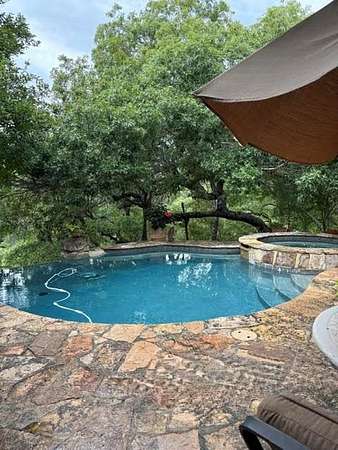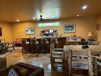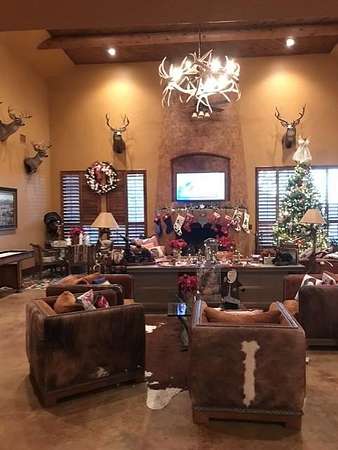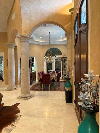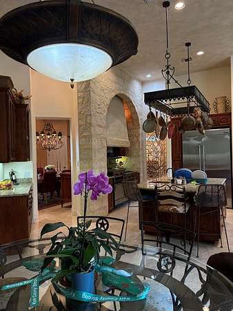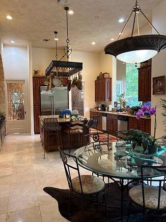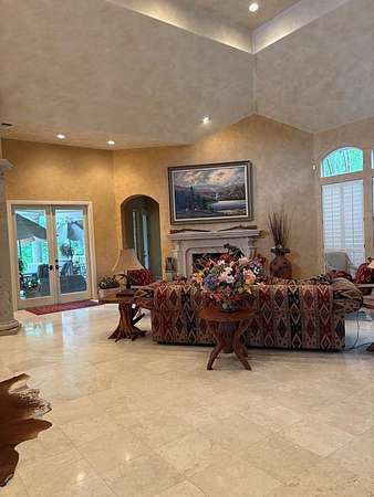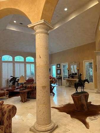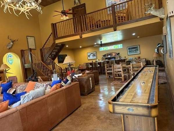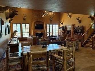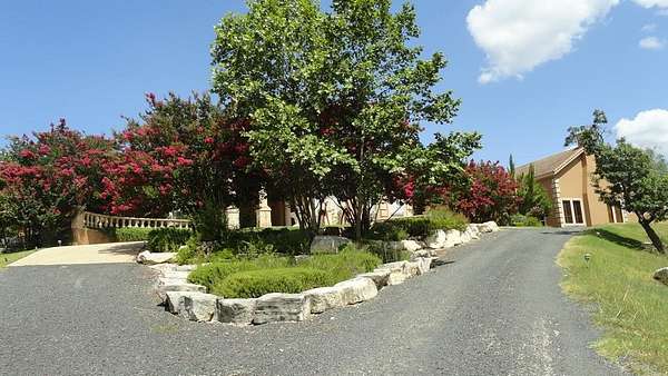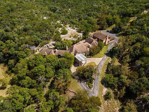 Spectacular 40-acre estate located just five miles from Kerrville, offering the serenity of free-roaming wildlife, a running creek, heavily wooded hillsides and breathtaking views and sunsets. From the porte-cochere entry through massive 10-ft doors, you'll be captivated by the grandeur of the great room, featuring soaring 22-foot ceilings. Hand-carved cantera stone columns from Mexico add a touch of elegance to both the interior and exterior. This exquisite home offers approximately 7,700+- sq.ft. of living space with travertine marble , carpet and stained flooring throughout. The residence features four bedrooms, six bathrooms and 1/2 bath. The impressive 50'x30' Trophy Room is ideal for entertaining, showcasing 20' ceilings, a large Santa Fe-Style fireplace, and a custom mesquite "Drinking Bar". Upstairs, enjoy a fully equipped media room with 10 leather recliners for the ultimate viewing experience. LREB