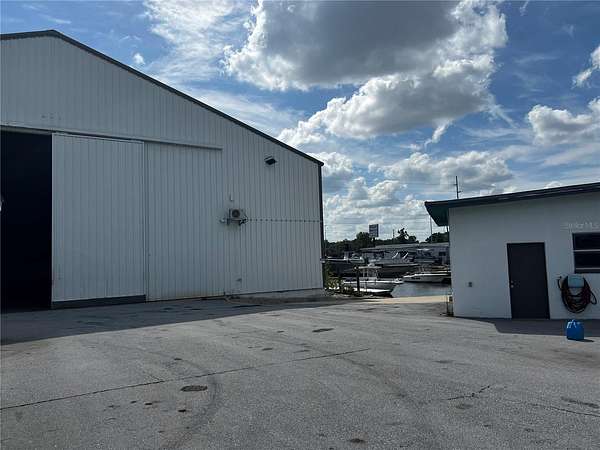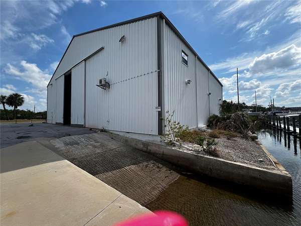 Marina/warehouse building 6750' for boat storage, 2 additional buildings 600' and 1200', all chain link fenced with two rolling gates, boat ramp and dock on the canal. Some water intrusion from Hurricane Helene, but little damage. Zoned C2 and AE flood zone. Just 1 mile to Hudson Beach. Great for boat storage. Possible seller terms.