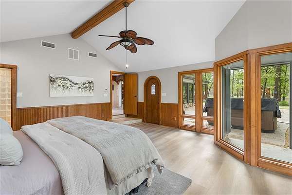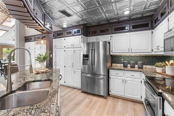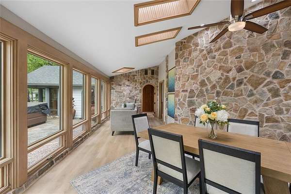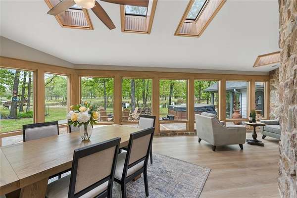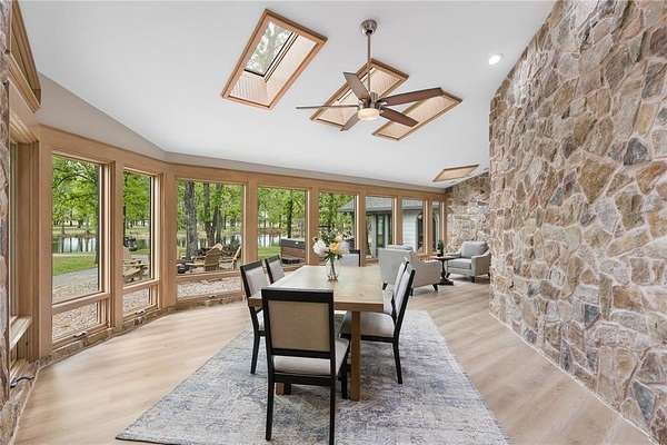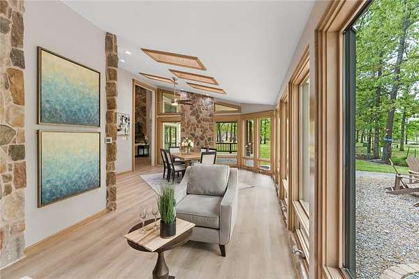 Inside, soaring vaulted ceilings, a floor-to-ceiling wood-burning fireplace, skylights, and walls of glass create a bright, inviting atmosphere. The open living and kitchen area overlooks the pond and features stainless steel appliances, granite countertops, pendant lighting, antique pressed-tin ceiling detail, abundant cabinetry, and a breakfast bar. A Ring security system adds peace of mind.