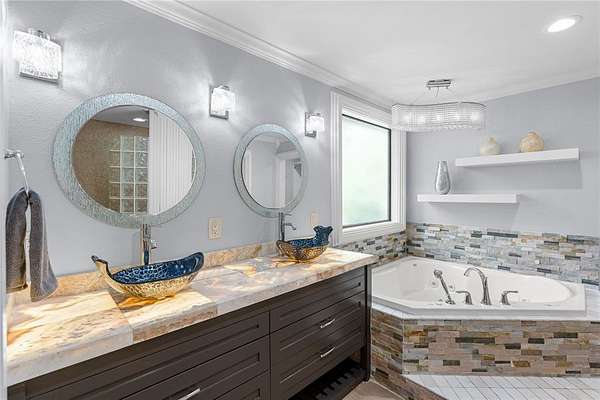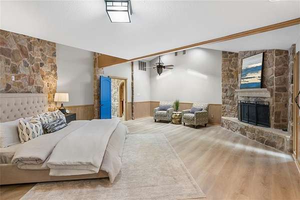 The primary suite features a fireplace, built-ins, and a spa-style bath with jetted tub, glass-block shower, and walk-in closet. Above the three-car garage, a nearly 1,100-square-foot bonus room-accessible by stairs or elevator-creates the perfect space for entertaining, a game room, or multi-generational living.