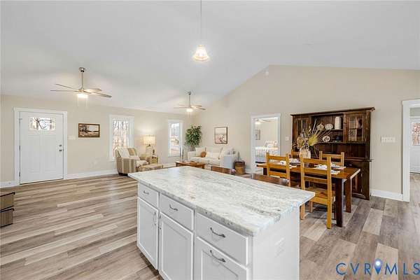 - Bedroom On Main Level, Cathedral Ceilings, Ceiling Fans, Dining Area, Granite Counters, Kitchen Island, Main Level Primary, Pantry, Recessed Lighting, Walk In Closets