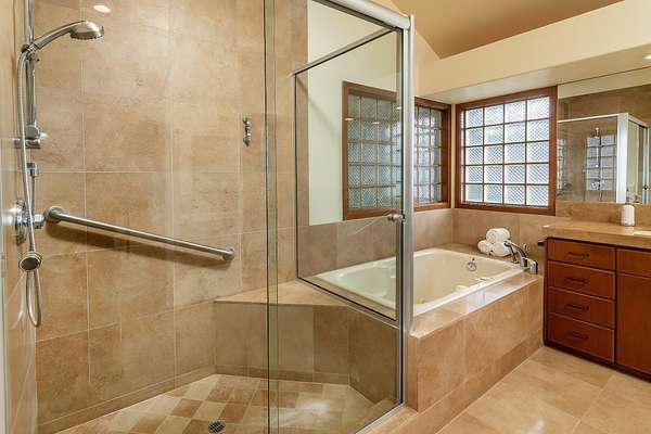 - Double Vanity, Kitchen Island, Linen Closet, Open Floorplan, Pantry, Primary Downstairs, Soaking Tub, Tile Shower, Vaulted Ceiling(s), Walk-In Closet(s)