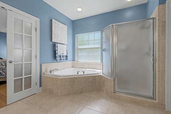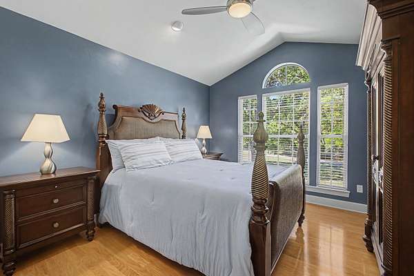 - Central Vacuum, Entrance Foyer, Garden Tub Roman Tub, High Ceilings, Pantry, Primary Downstairs, Split Bedrooms, Tray Ceilings, Vaulted Ceilings, Walk In Closets