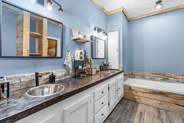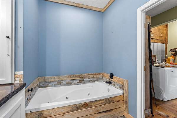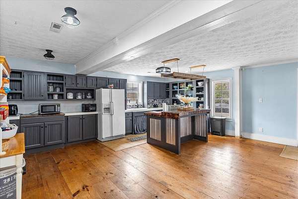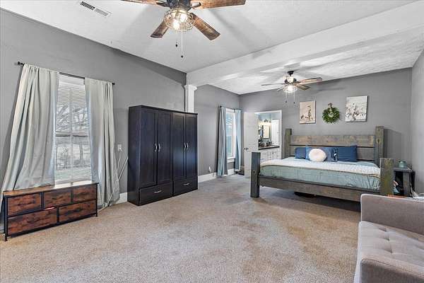 - Beamed Ceilings, Breakfast Bar, Ceiling Fan(s), Chandelier, Crown Molding, Eat-In Kitchen, Entrance Foyer, High Ceilings, High Speed Internet, Kitchen Island, Natural Woodwork, Pantry, Primary Downstairs, Separate Dining Room, Separate Shower, Sitting Area, Split Bedrooms, Tile Counters, Tub/Shower Combo, Walk-In Closet(s), Whirlpool Tub