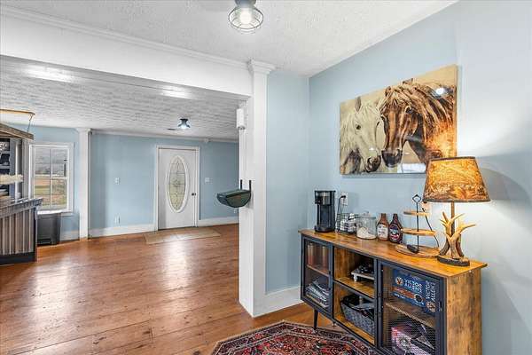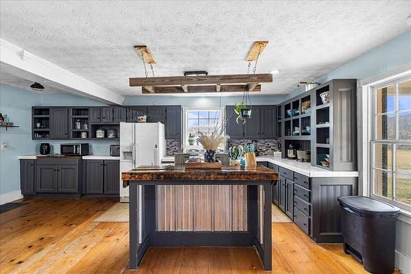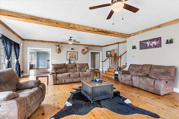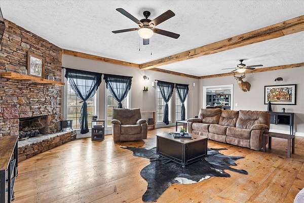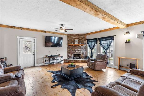 Nestled on 10.74 acres, this charming 1900s farmhouse offers breathtaking, ever-changing views and the serenity of country living. Brand new metal roof, windows, gutters and shutters. Featuring 4 spacious bedrooms, with the master and additional bedroom on the main floor, and 3 bathrooms upstairs, this home provides both comfort and functionality. The large, bright eat-in kitchen with a breakfast island is perfect for family gatherings, while the separate dining room offers further space for entertaining. Relax in the cozy open den, complete with a beautiful stone fireplace. With 3 fireplaces throughout, a bonus room, and a 5-stall barn featuring awnings for extra storage, electricity, and water, this property is truly equipped for country living. Additional features include a smoke shed, a storage building, and fully fenced acreage with 5 accessible pastures, each with gates for easy entry. Don't miss out on this exceptional homestead. Call today for your private tour!