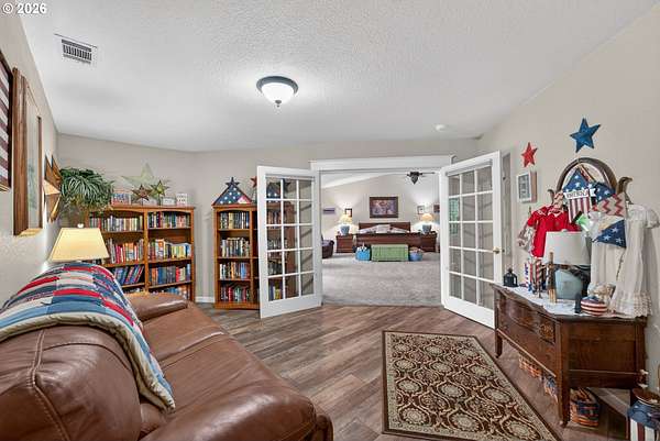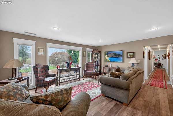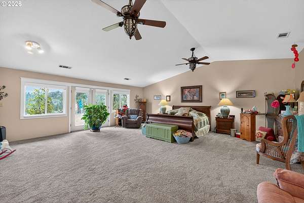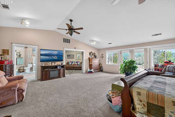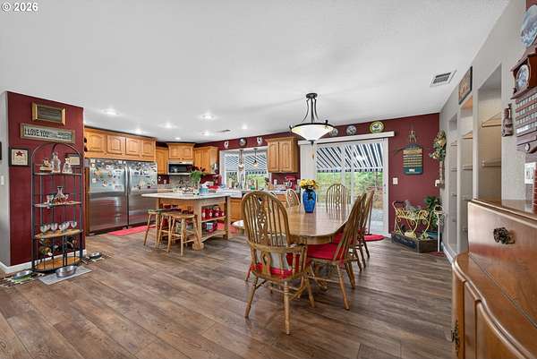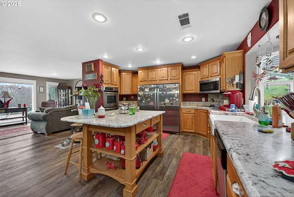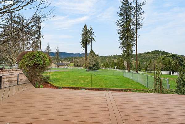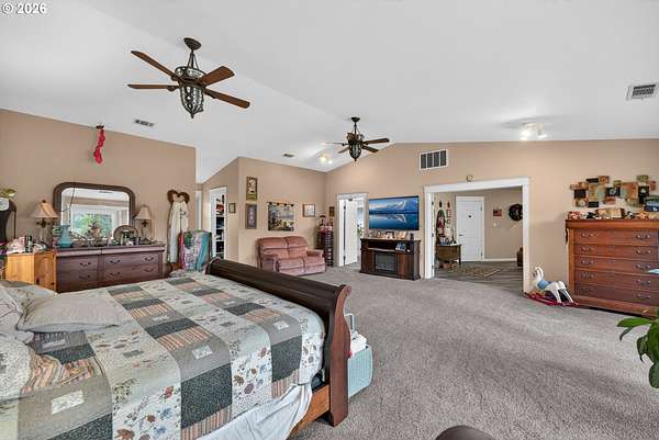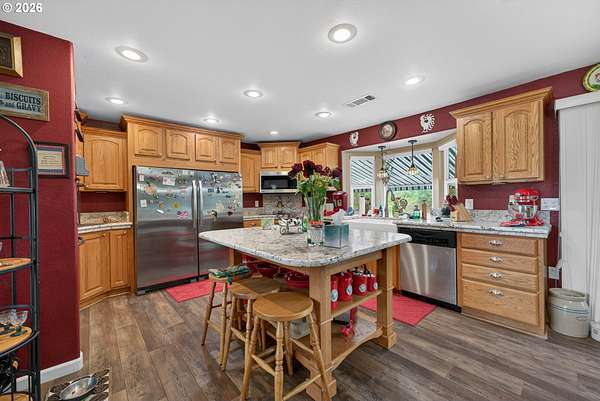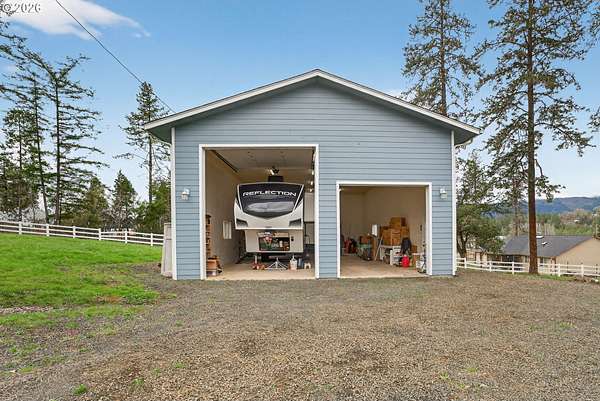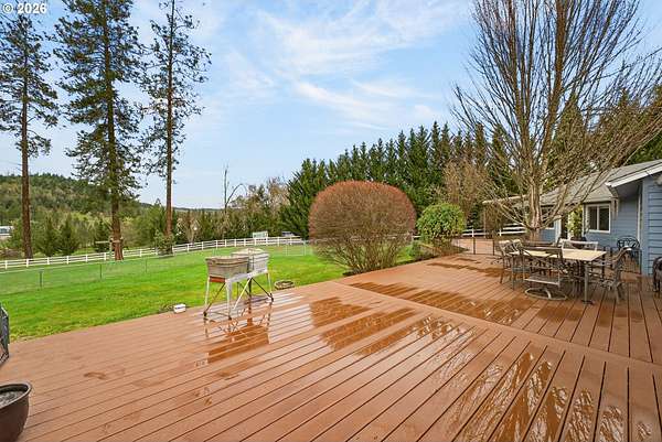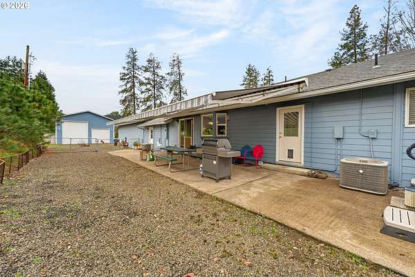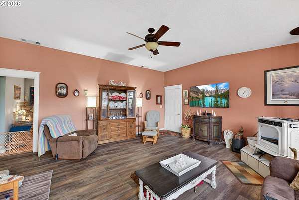 Welcome to this beautifully appointed 4-bedroom, 2-bath home offering space, comfort and exceptional amenities inside and out. Step inside to find a spacious living room and separate family room featuring a stylish LVP flooring, perfect for everyday living and entertaining. The primary suite is complete with French doors that open to the deck, a cozy sitting area entry, double walk-in closets, plush carpet, and two ceiling fans for year-round comfort. The luxurious bathroom features tile flooring, granite countertops, dual ceiling fans, a relaxing jetted jacuzzi tub, and a separate stand-up shower. The kitchen is designed for function and beauty with granite countertops, a center island, custom oak cabinetry, an oversized stainless steel refrigerator, and the rare convenience of two dishwashers - ideal for gatherings and busy households. The tiled laundry room offers abundant storage space and includes the washer and dryer. Outdoor living is just as impressive. A Trex deck spans the full length of the front of the home, with a retractable awning covering a portion for shaded enjoyment. The back of the home also features a retractable shade awning and enclosed chain-link fencing. A vinyl fence outlines the property perimeter, with chain-link fencing just off the front deck - perfect for keeping small animal secure. The impressive 30x50 shop/RV storage includes electrical hookups, making it ideal for hobbies, storage, or recreational vehicles.